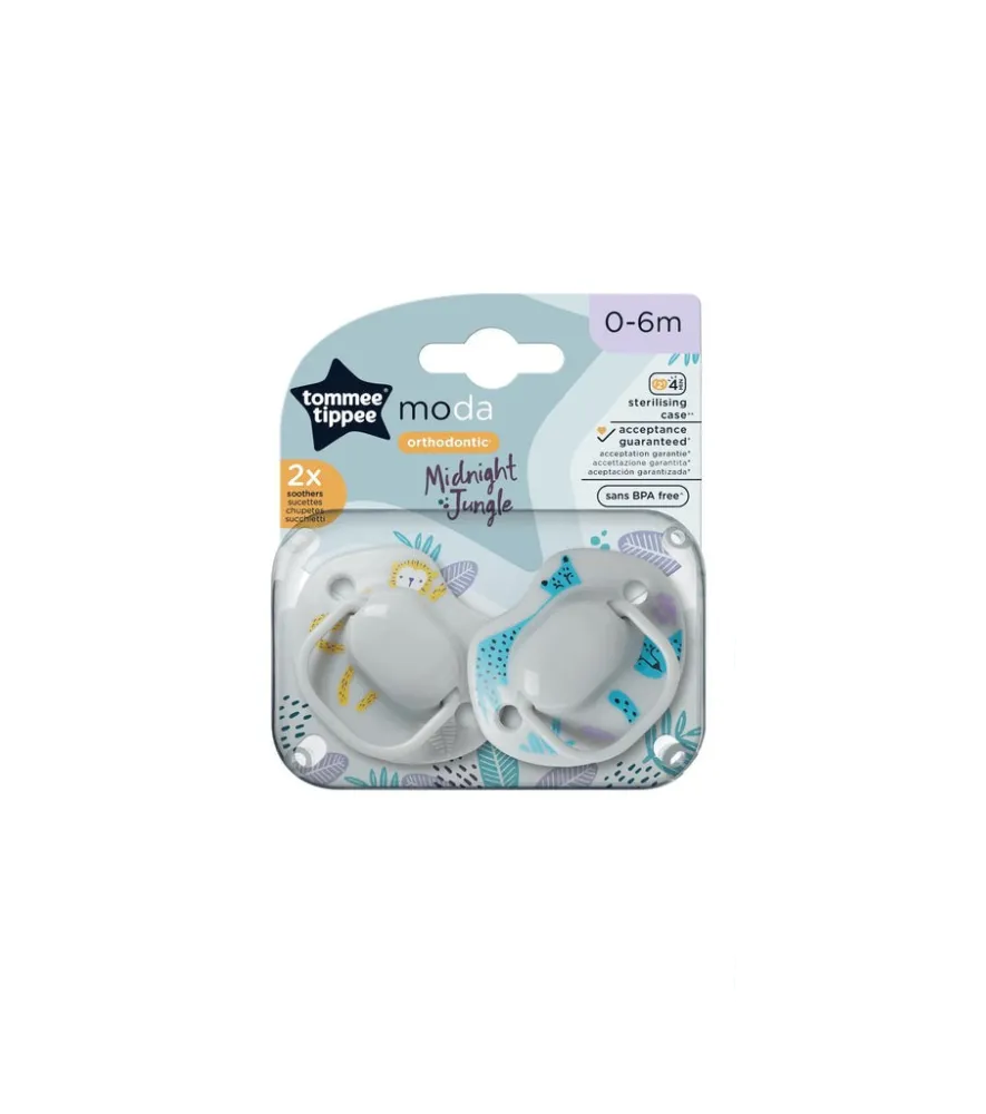 Give your baby the best start with Tommee Tippee Moda Orthodontic Soothers! These soothers are designed to promote healthy oral development with their orthodontic shape. The soft, BPA-free silicone nipple is gentle on baby's skin, and the cute Midnight Jungle design is sure to be a hit. Plus, they come with a handy sterilising case for peace of mind.