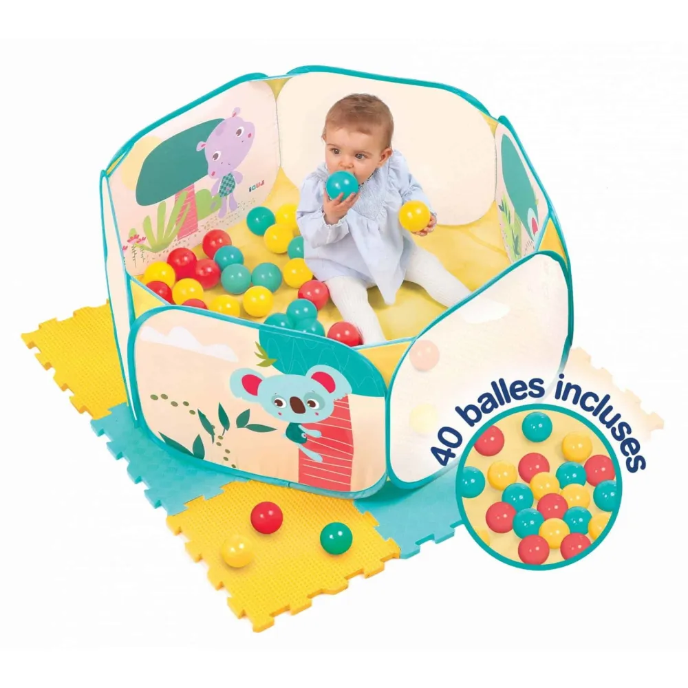 A A complete set that will delight children! Discover in this early learning set three play activities to combine according to their preferences. Rediscover the essential game of bowling, a standard appreciated by all generations! This cute family of multicolored raccoons in soft plastic is easy for little hands to grasp. With the spiked ball, baby becomes a real little bowling champion! They learn to aim, roll an object and develop their imagination. Children have fun knocking over the pins and thus exercise their skills. To stack and play at building beautiful towers, you will find a set of 4 geometric shapes with soft and colorful spikes. Children thus exercise their finger grasping ability, but also their concentration and patience for stacking. With the handling and help of their parents, little ones will quickly recognize the different shapes and colors. Also discover a set of 24 small, thick foam tiles (1.2cm). This large puzzle offers children several play possibilities: By assembling all the pieces, the tiles form a beautiful mat for crawling and having fun with the other toys. Resistant and comfortable, the mat insulates from the cold and absorbs shocks. Install the tiles lengthwise to create a bowling alley! Children will love playing on their dedicated space. The small size of the tiles allows for construction play (cubes, etc.). Make way for ingenuity! The numbers on the tiles allow children to learn to count. The tiles with printed shapes are designed to be linked to the numbers. Thus, the child can associate the number 2 with the 2 clouds, the number 3 with the 3 drops, etc. By connecting the numbers with the shapes, children will develop the concept of quantities. Clever, the tiles offer a number fitting activity in addition to the puzzle. Fun and educational games The bright colors of the toys attract children's attention. These games easily withstand time and sudden movements. Specially designed for crushing and comfort, children will not be able to hurt themselves in the event of small falls. The different textures of the toys and their vibrant colors encourage your child's fine motor skills, dexterity and visual acuity while stimulating their imagination. Very resistant, the toys are proof against chewing and throwing of all kinds! Tiles are hand washable in cold water and resist deformation. Geometric shapes and skittles made of 100% PVC. Dimensions of a skittle: 6 x 15 x 6 cm. -Dimensions of a geometric shape: 8 x 10.5 x 8 cm. Easy cleaning of the skittles and shapes with a damp cloth.