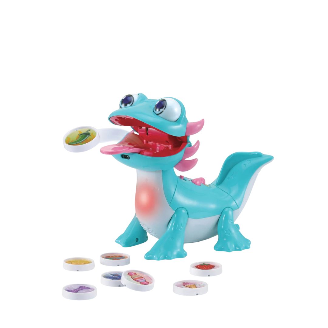 - Item dimensions: 18 cm x 12 cm x 17 cm Smell detector allows Zebulon to "sniff" game pieces before "eating" them Changes color in the belly to express emotions Speaks and sings to enhance interactivity Animated eyes, mouth, and tongue for a realistic experience Cuddly design; reacts to being petted Two game modes: Quiz and Music Develops fine motor skills and teaches colors and foods Storage compartment for easy piece management Automatic shut-off and volume adjustment features Powered by 4 LR6 batteries (included)