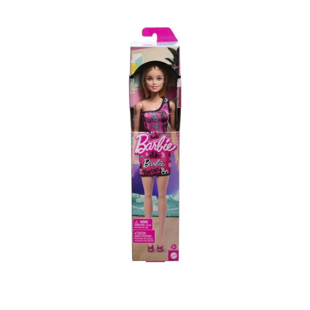 - Features a removable asymmetric off-the-shoulder pink dress, adorned with the Barbie logo in black and white