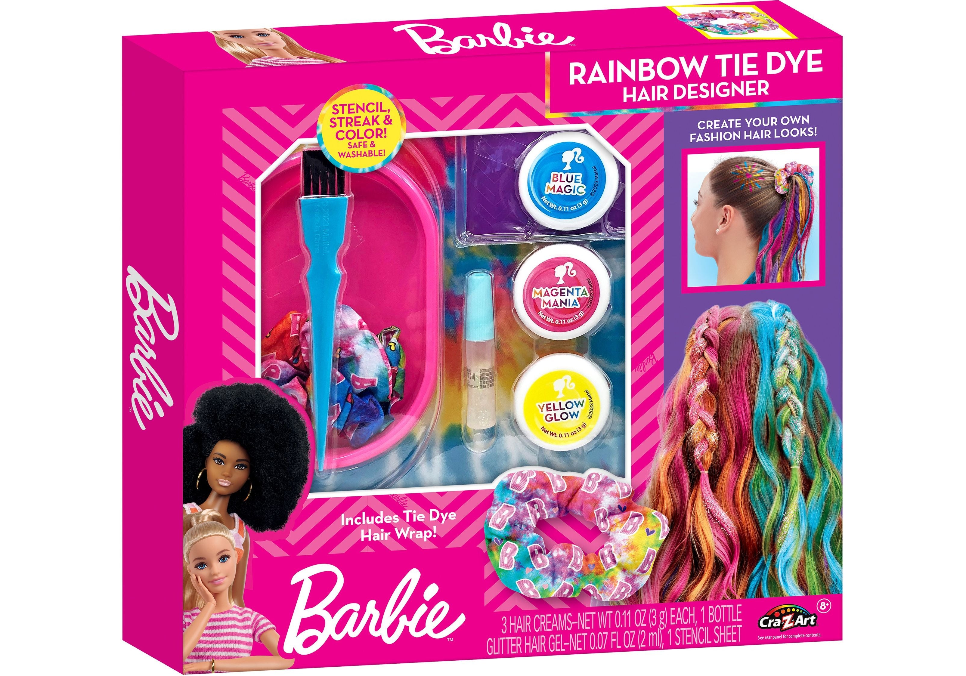 Barbie Hair Designer set in Rainbow Tie-Dye, offering a 2-in-1 hair play experience with cool rainbow effects. This set allows you to create custom tie-dye colors and make your own tie-dye hair wraps, featuring easy-to-apply crأ¨me hair color and a special Tie Dye Wraps Maker for mess-free application. With options for stenciling, streaking, adding glitter, and wearing your creations, this set is suitable for ages 8 and up. Please follow directions for safe use, including avoiding application to sensitive skin or near eyes and mouth. Products and colors may vary.