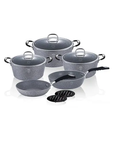 10 pcs cookware set, Gray Stone Touch Line Material: forged aluminum Handle: stainless stell with heat resistant silicone Include: Frypan ?20*4,5 cm 1,0L Deep frypan ?24*6,5 cm 2,3L Casserole with lid ?20*10,4 cm 2,5L Casserole with lid ?24*11,8 cm 4,1L Casserole with lid ?28*12,4 cm 6,1L 2 pcs black bakelite pads