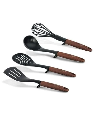 • Material: nylon • Include: • Slotted turner 1 pc • Whisk 1 pc • Skimmer 1 pc • Soup ladle 1 pc • Color: black- rosewood pattern handle • Funcional and stylish utensil to suit everyone • Efficiently and hygenically • Clever tool rest to keep your surface clean
