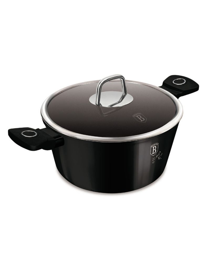 Berlinger Haus Black Vantage 24CM CASSEROLE WITH LID b/6 3x durable non-stick titanPro coating Stay cool ergonomic soft touch handle Tempered glass lid with soft close heat resistant stainless steel system Steam hole Minimalist style Matt finish Turbo induction based Suitable for all type of hobs ECO friendly PFOA, LEAD, Cadmium free Easy to clean Material: forged aluminum with non-stick titanPro coating Casserole with lid diameter: 24X11,8 cm 4,1L Color: shiny black