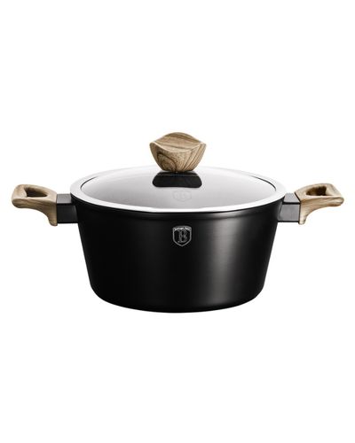 Casserole with lid, 24 cm, Ebony Maple Collection Material: forged aluminum Size: 24*11,8 cm 4,1L Color: matt black, light wooden pattern handle ? 3 LAYER NEW GRANIT-MARBLE COATING ? ERGONOMIC SOFT TOUCH HANDLE ? TURBO INDUCTION BASED ? T-GLASS LID