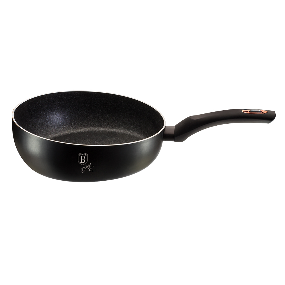 Flip frypan, 26 cm, Black Rose Collection FREE PROTECTOR Material: forged aluminum Frypan ?26 cm 2,8L Color: matt black/ silver BONUS PROTECTOR ? 3 LAYER MARBLE COATING ? ERGONOMIC SOFT TOUCH HANDLE ? TURBO INDUCTION BASED ? SAVE 35% ENERGY ? ELEGANT DESIGN