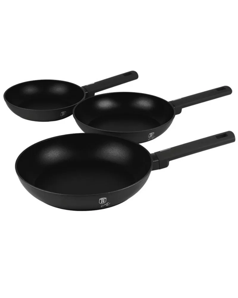 Berlinger Haus Matte Black 3PCS FRYPAN SET b/6 Upgrade your kitchen with the Berlinger Haus BH8195 Frypan Set. This set includes three versatile pans, perfect for all your cooking needs. From quick breakfasts to elaborate dinners, these pans deliver exceptional performance and style. ??? Premium Quality and Design Material: Constructed from forged aluminum, these frypans offer robust durability and excellent heat distribution. Sizes: ?20 x 4.5 cm (1.0L): Ideal for small servings or side dishes. ?24 x 4.8 cm (1.7L): Perfect for medium-sized meals. ?28 x 5.2 cm (2.4L): Great for larger portions or family meals. Color: Featuring a matte black finish, they add a sleek, modern touch to your kitchen. 3 pcs frypan set,Berlinger Haus, BH8195,Matte Black ?? Enhanced Cooking Performance 3x Non-Stick titanPro Coating: The triple-layer coating ensures superior non-stick performance, making cooking and cleaning a breeze. Stay Cool Handles: Ergonomic soft-touch handles remain cool during cooking, providing a comfortable and safe grip. Minimalist Style: The simple yet elegant design seamlessly fits any kitchen décor. ?? Efficient Heating and Versatility Turbo Induction Base: Equipped with a turbo induction base, these pans heat up quickly and evenly, saving you time and energy. Universal Compatibility: Suitable for all types of hobs, including induction, gas, electric, and ceramic. ?? Eco-Friendly and Safe Eco-Friendly: Free from PFOA, lead, and cadmium, ensuring a healthier cooking environment. Easy to Clean: The non-stick coating simplifies cleanup, so you spend less time scrubbing and more time enjoying your meal. Why Choose the Berlinger Haus BH8195 Frypan Set? Versatility: With three different sizes, you can handle various cooking tasks effortlessly. Efficiency: The turbo induction base ensures faster heating and energy savings. Stylish and Functional: These pans combine a sleek design with practical features for everyday use. Elevate your cooking experience with the Berlinger Haus BH8195 Frypan Set. Enjoy superior performance and style with every meal. ????