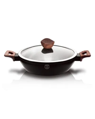 Shallow pot with lid, 28 cm, Ebony Maple Collection Material: forged aluminum Size: 28*7,5 cm 3,8L Color: matt black, light wooden pattern handle ? 3 LAYER NEW GRANIT-MARBLE COATING ? ERGONOMIC SOFT TOUCH HANDLE ? TURBO INDUCTION BASED ? T-GLASS LID