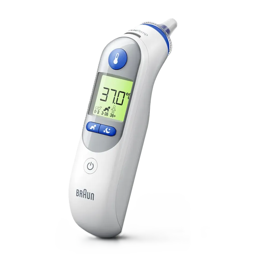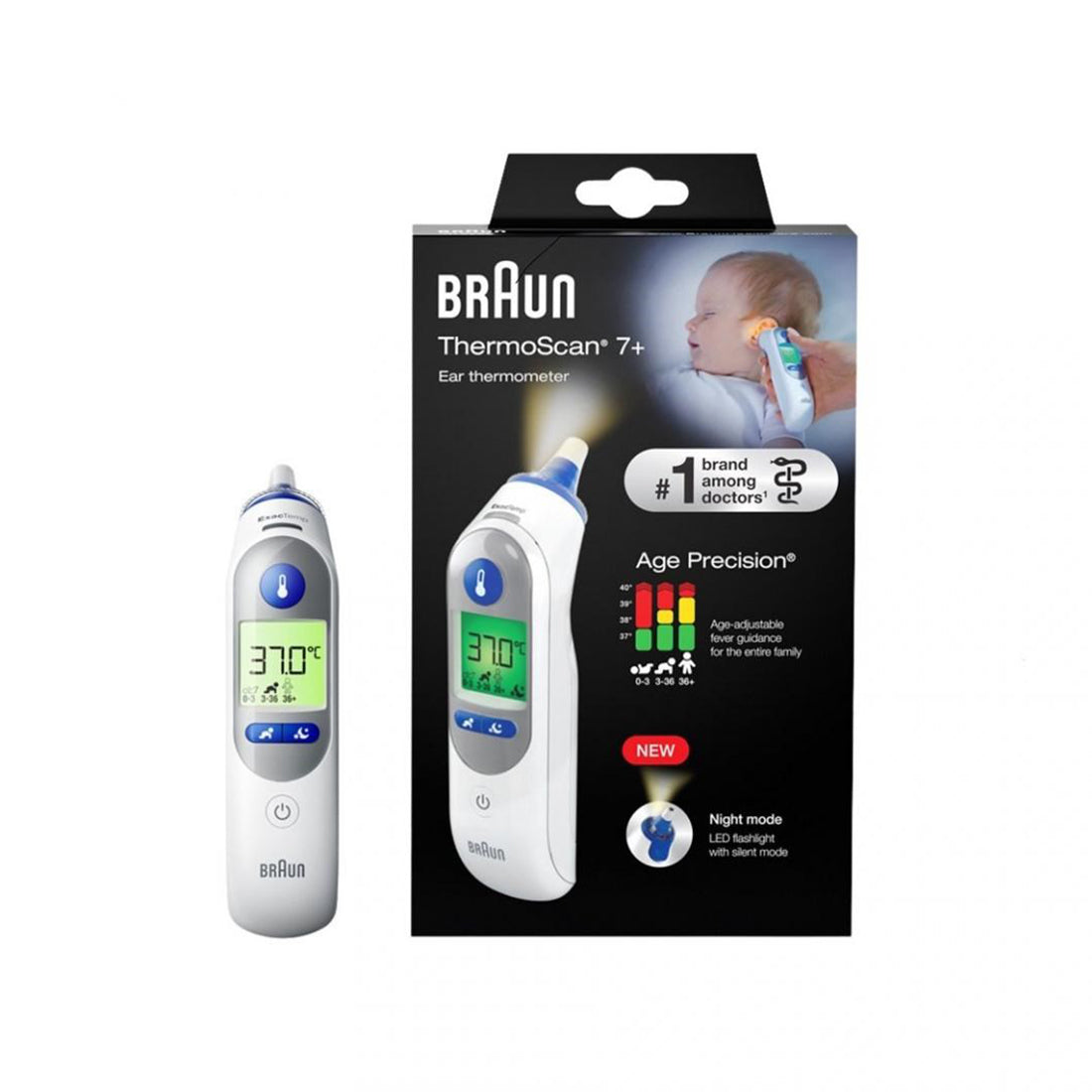 Braun ThermoScan® 7+ ear thermometer - fast, gentle and easy to use. The definition of fever changes with age**. The Braun ThermoScan® 7+ features the patented Age Precision® Technology - an age-adjustable fever guidance that takes age into account to take the guesswork out of temperature measurement. The thermometer comes with night mode that features light for easy use in the dark and silent mode for avoiding wake-ups