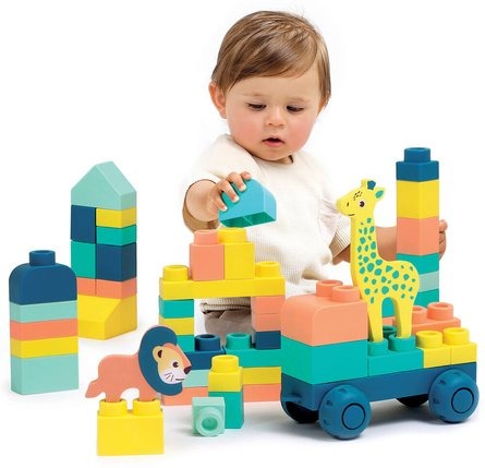 Designed for little builders aged 12 months and up, this set of 53 soft, colorful bricks is the perfect introduction to the world of construction.