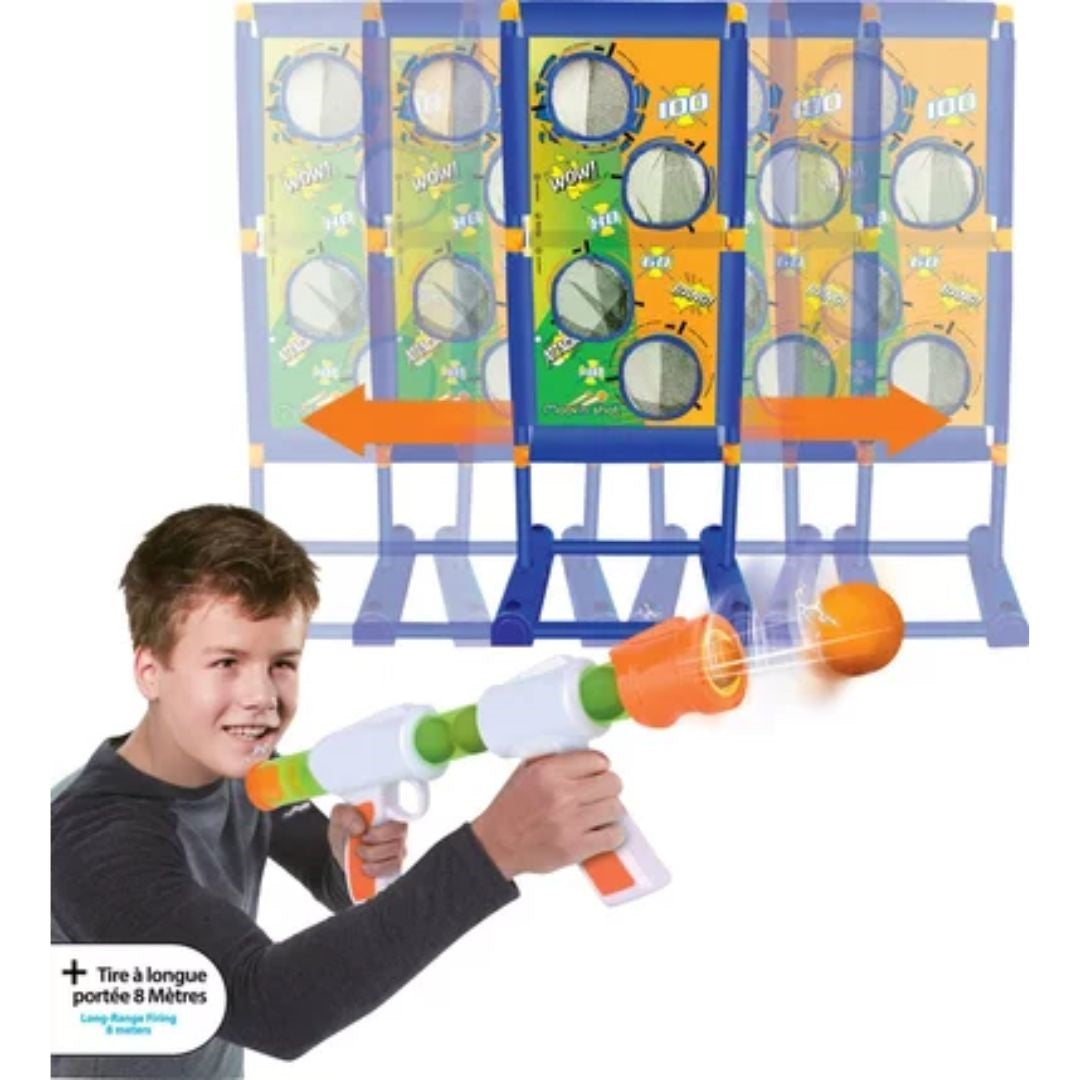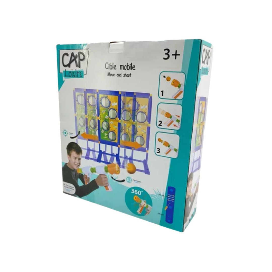 The Cap Loisir Cible Mobile is an interactive shooting game designed for children aged 3 and up. It includes a pneumatic air gun and 15 soft foam balls, offering safe and exciting long-range shooting up to 8 meters. With its moving target and point system, it's perfect for backyard tournaments, helping kids develop accuracy and coordination. Easy to set up and powered by 4 AA batteries (not included).