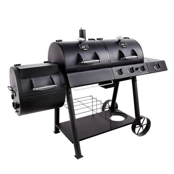 Smoke or grill how you like with the Oklahoma Joe's® Longhorn Combo Charcoal/Gas Smoker & Grill. Equipped with both a charcoal and gas grill chamber and an attached offset firebox, this multi-purpose smoker and grill allows you to barbecue your way. Built with durability in mind, porcelain-coated cast-iron grates and heavy-gauge steel construction ensure easy cooks and delicious food every time.Separate cooking chambers for high-capacity smoking, charcoal grilling or gas grilling