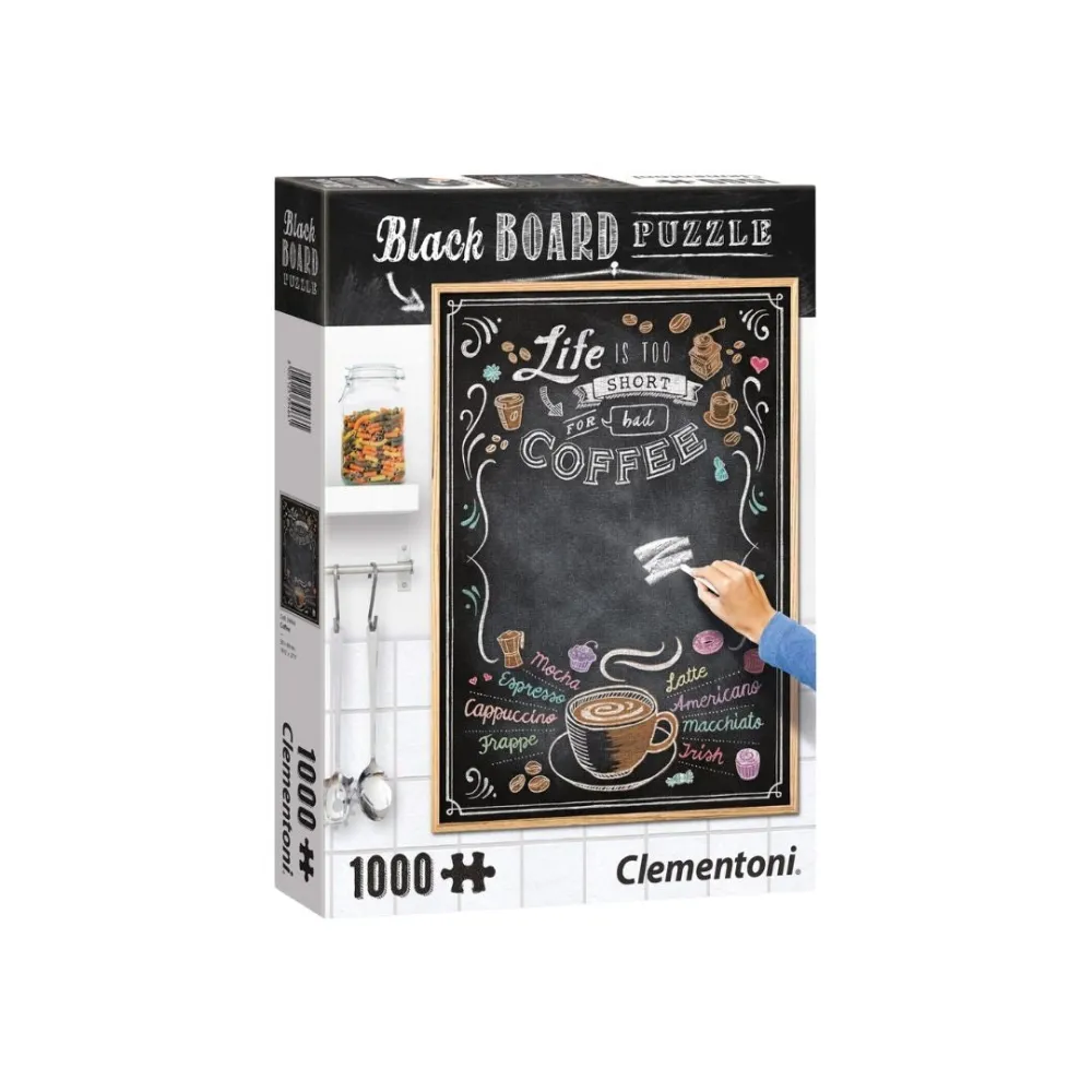 The Clementoni Chalkboard Blackboard Coffee Puzzle combines the fun of a jigsaw puzzle with the creativity of a chalkboard. Assemble 1000 pieces, many of which are black, to complete the image, then frame it and use chalk to write on the finished artwork.