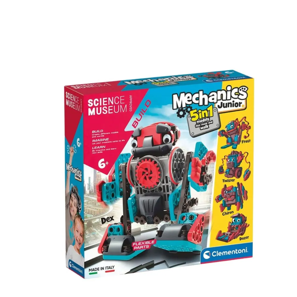 The Clementoni?� Mechanics Junior kit introduces young children to a hands-on approach to robotics. With easy-to-assemble components, kids can create five unique moving robots, each offering a distinctive challenge and playful movement. This kit promotes creativity and problem-solving skills while allowing children to explore their ideas in a fun way.Key Features: