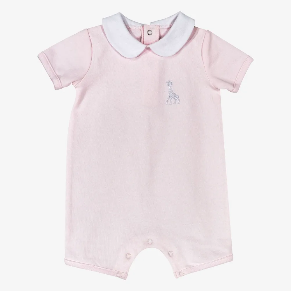 Give this pretty pink romper with a white Peter Pan collar to your little princess. With its lovely Sophie la Girafe motif embroidered in white, this romper will melt your little heart. Practical, this romper will allow your baby to move freely and play with peace of mind. The romper has 5 snap buttons at the crotch, making it easy and convenient to change baby's diaper. No need to remove the entire romper! It also has snap buttons at the back.