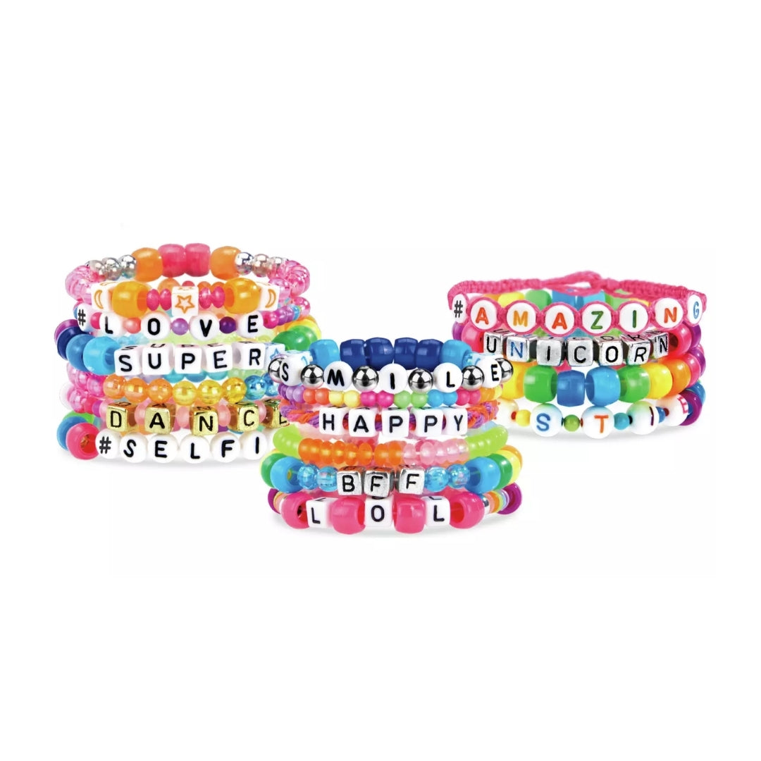 Create stylish friendship bracelets in bold, attention-grabbing colors. Make pieces to wear, trade, or gift. Add personal messages with alphabet beads. The kit provides more than 800 beads so you can design a wide range of custom looks.