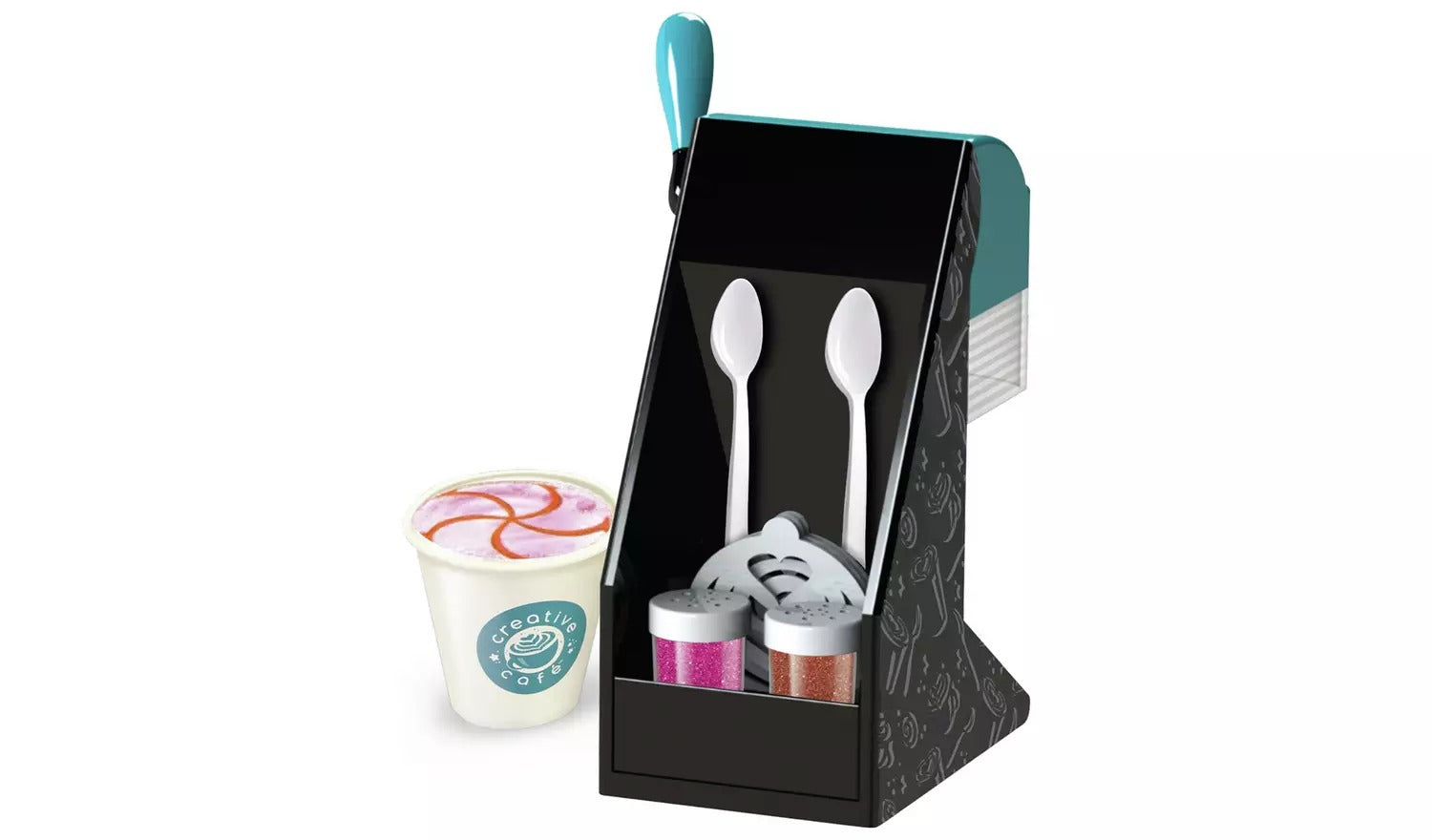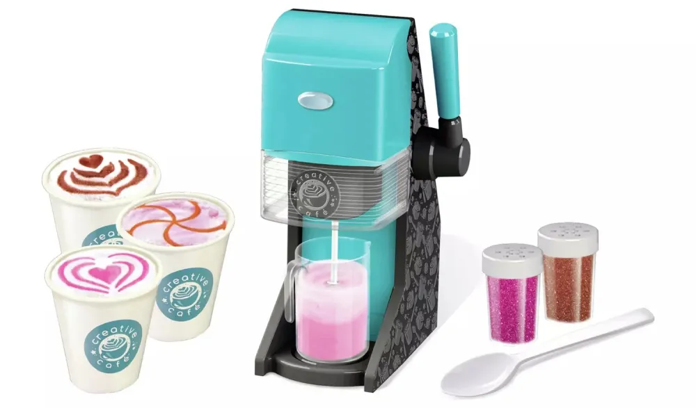 Creative Cafأ© Barista Bar, The Stylish Barista Bar offers an authentic cafe experience for aspiring young baristas. Resembling a real cafe-style machine, this creative set includes a battery-powered whisk that froths real milk, eliminating the need for heat. The process is made easy, fun, and safe, as outlined in the accompanying recipe cards. Users follow simple steps to mix the powder base, blend it with the lever, and froth the milk, resulting in a delightful foamy finish.