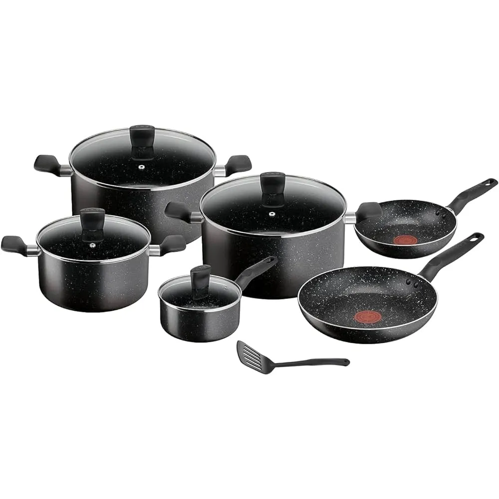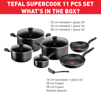 Set of 11 pieces: Stewpot 22cm+lid/ 24cm+lid/ Stewpot 28 +lid / Frypan 20/ 28/ Saucepan 16+lid/ Spatula MINERALIA NON-STICK COATING: Discover durable non-stick performance and perfect glide for easy low-fat cooking every day SAFE NON-STICK COATING : Safe non-stick, no PFOA, no Lead, no Cadmium. Stricter controls than those required by current food contact regulations. No PFOA in compliance with applicable regulations. No Lead, No Cadmium (no Pb, no Cd) means no intentional addition of Pb and Cd in the coatings and not detected by tests conducted by external laboratories. HEAT INDICATOR: The innovative Thermo-Spot changes color when it's time to start cooking, for perfect searing every time ESSENTIAL FORMAT: Frypan for easy-to-prepare recipes that are sure to please, such as omelets, burger patties and grilled chicken DEPENDABLE FORMAT: The perfect pots for crowd-pleasers ranging from spaghetti Bolognese to corn on the cob—or even homemade popcorn GLASS LID: The elegant glass lid speeds up your cooking time and ensures easy monitoring COMFORT GRIP HANDLE: An ergonomic design for added safety and convenience STOVETOP COMPATIBILITY: Compatible with all stovetops—gas, electric and ceramic—excluding induction