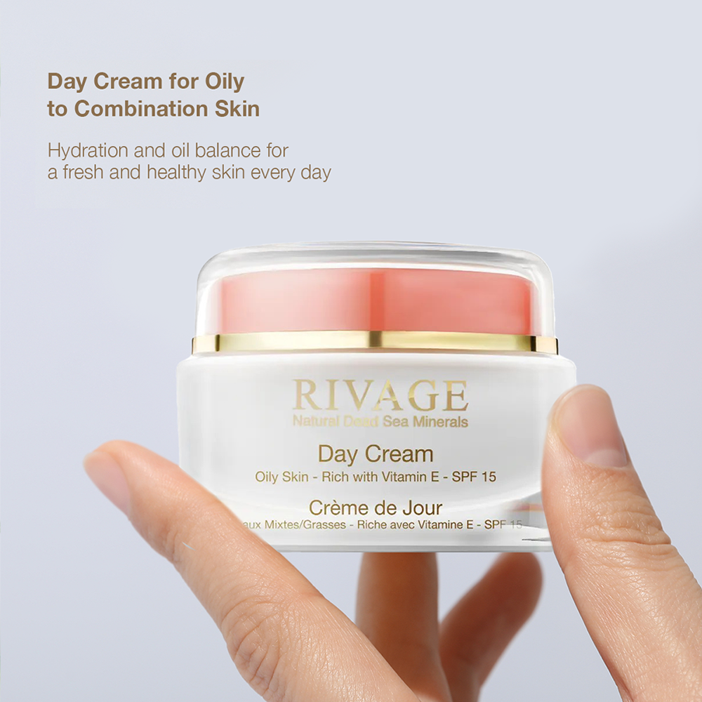 Apply an adequate amount of Rivage Day Cream for Oily Skin onto your face and neck.