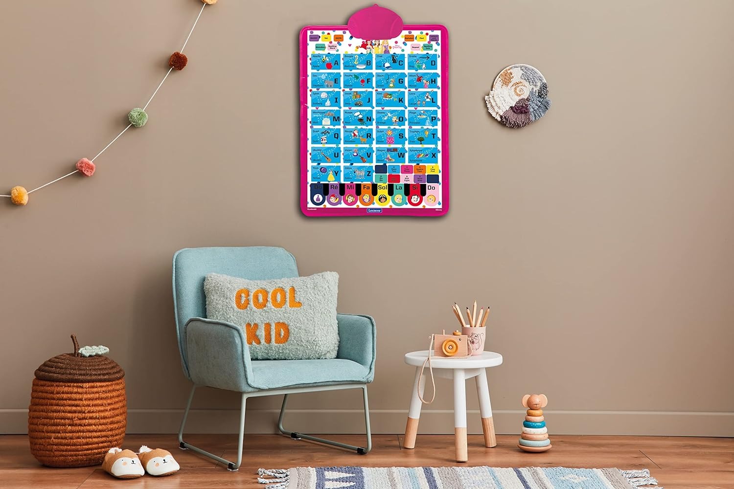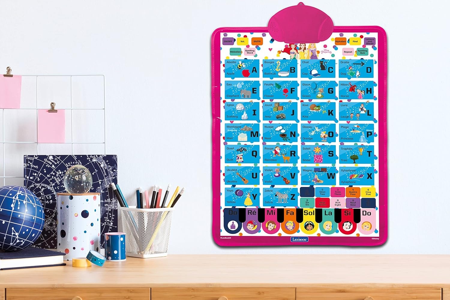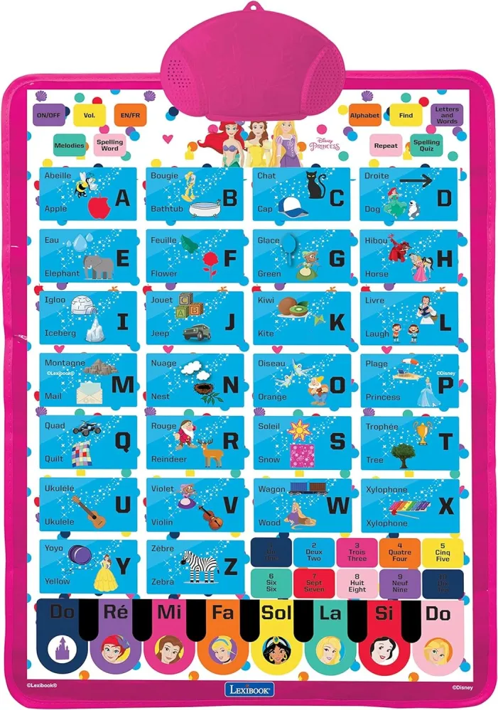 Disney Princesse Bilingual talking educational poster designed for interactive learning of the alphabet and vocabulary, is intended for wall hanging, providing an accessible platform for play and learning. Various game modes include spelling words, alphabet exercises, and quizzes, offering a multifaceted learning experience. Immerse in the world of Disney Princesses with tunes and learn music notes using the built-in Disney Princess piano. The portable design allows for easy transportation, and the power supply requires 3 x AAA/LR03 1.5V batteries, which are not included.