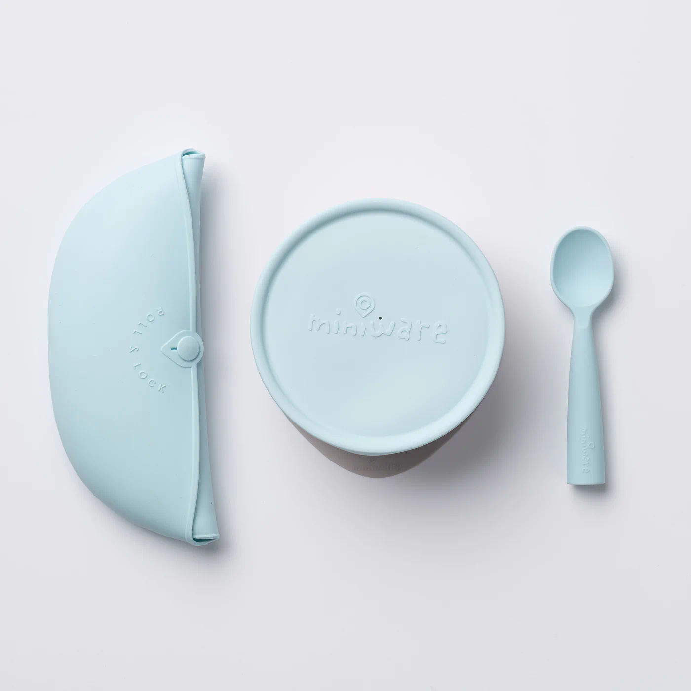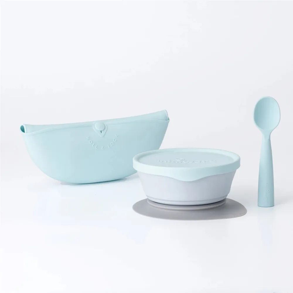 suction foot, lid, roll & lock bib and training spoon / 100% food grade silicone