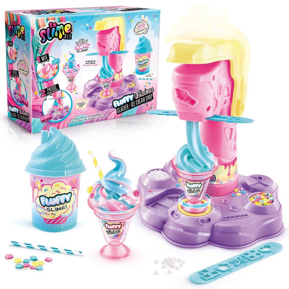 So Slime DIY Fluffylicious Ice Cream Shop, Create and decorate your own slime sundaes with the So Slime DIY Fluffylicious Ice Cream Shop kit. Featuring marshmallow-scented fluffy slimes and various accessories, this kit allows you to press, swirl, and decorate your slime creations, offering a fun and creative slime-making experience for kids.