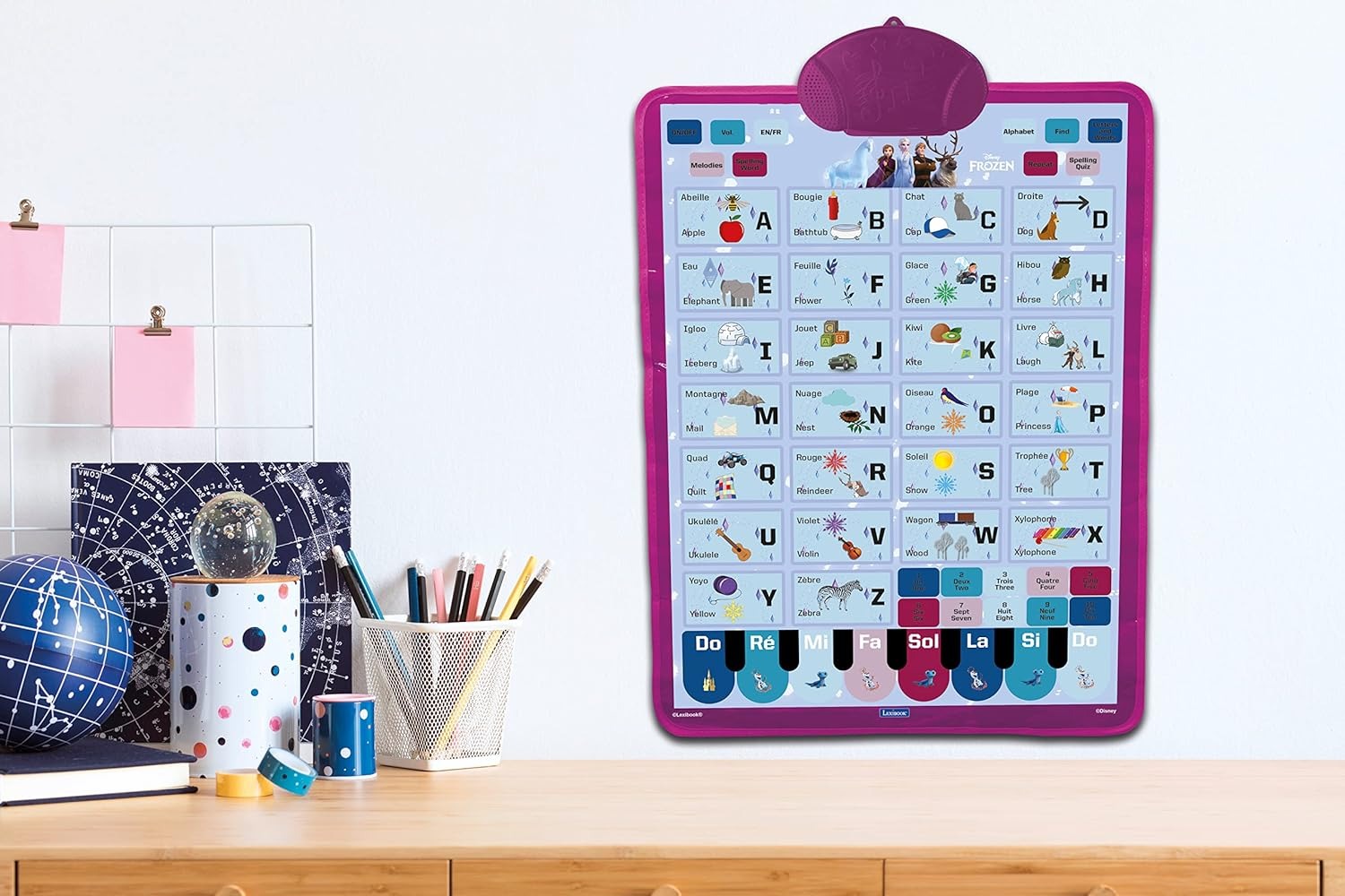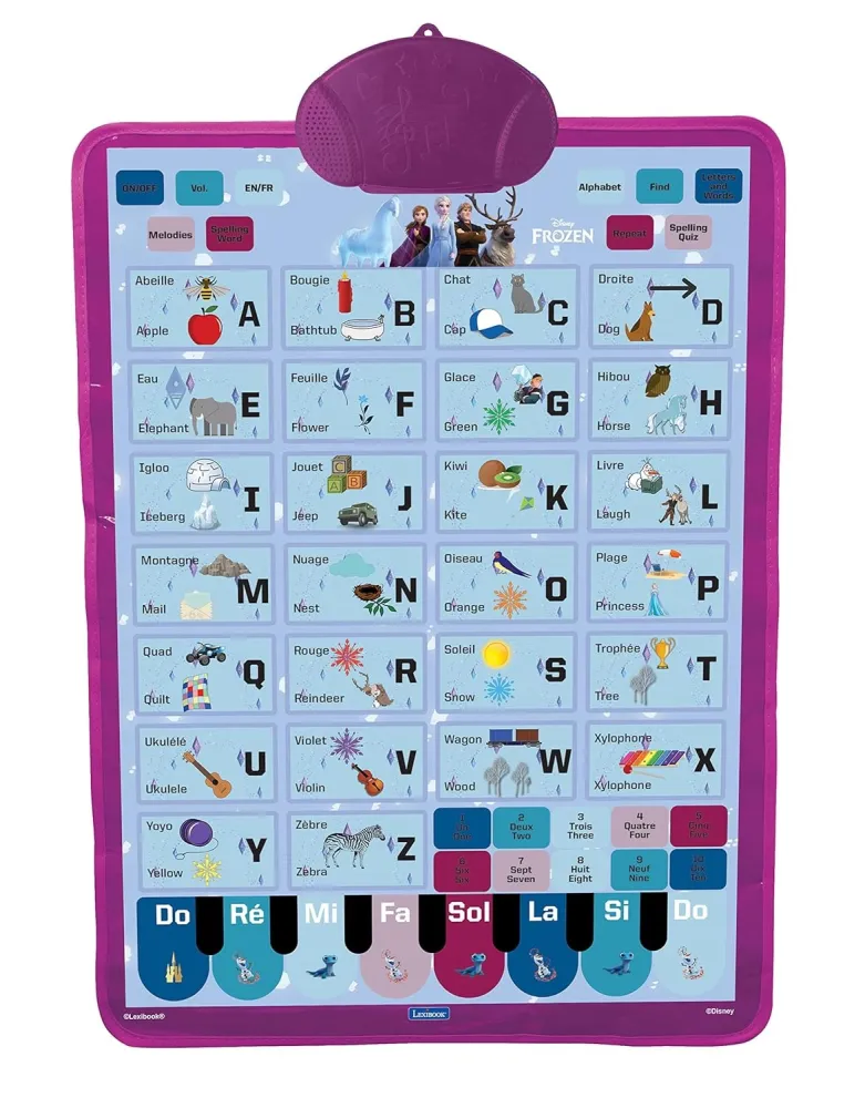Frozen Bilingual talking educational poster designed for interactive learning of the alphabet and vocabulary, is intended for wall hanging, providing an accessible platform for play and learning. Various game modes include spelling words, alphabet exercises, and quizzes, offering a multifaceted learning experience. Immerse in the world of Frozen with tunes and learn music notes using the built-in Frozen piano. The portable design allows for easy transportation, and the power supply requires 3 x AAA/LR03 1.5V batteries, which are not included.