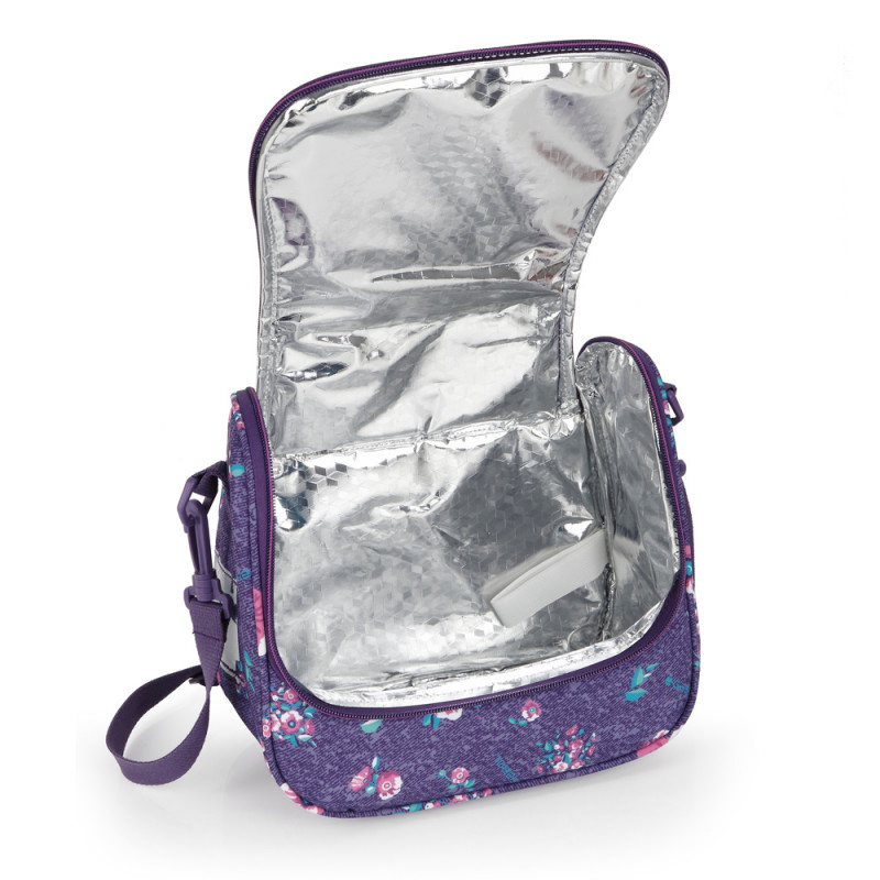 LILY thermal lunch bag. Made of PVC-free material with high-quality, high-density fabric. BPA-free. Water-resistant. Includes a name tag. Strap for attaching to a trolley or suitcase. Padded interior. Dimensions: 25 x 21 x 13 cm.
