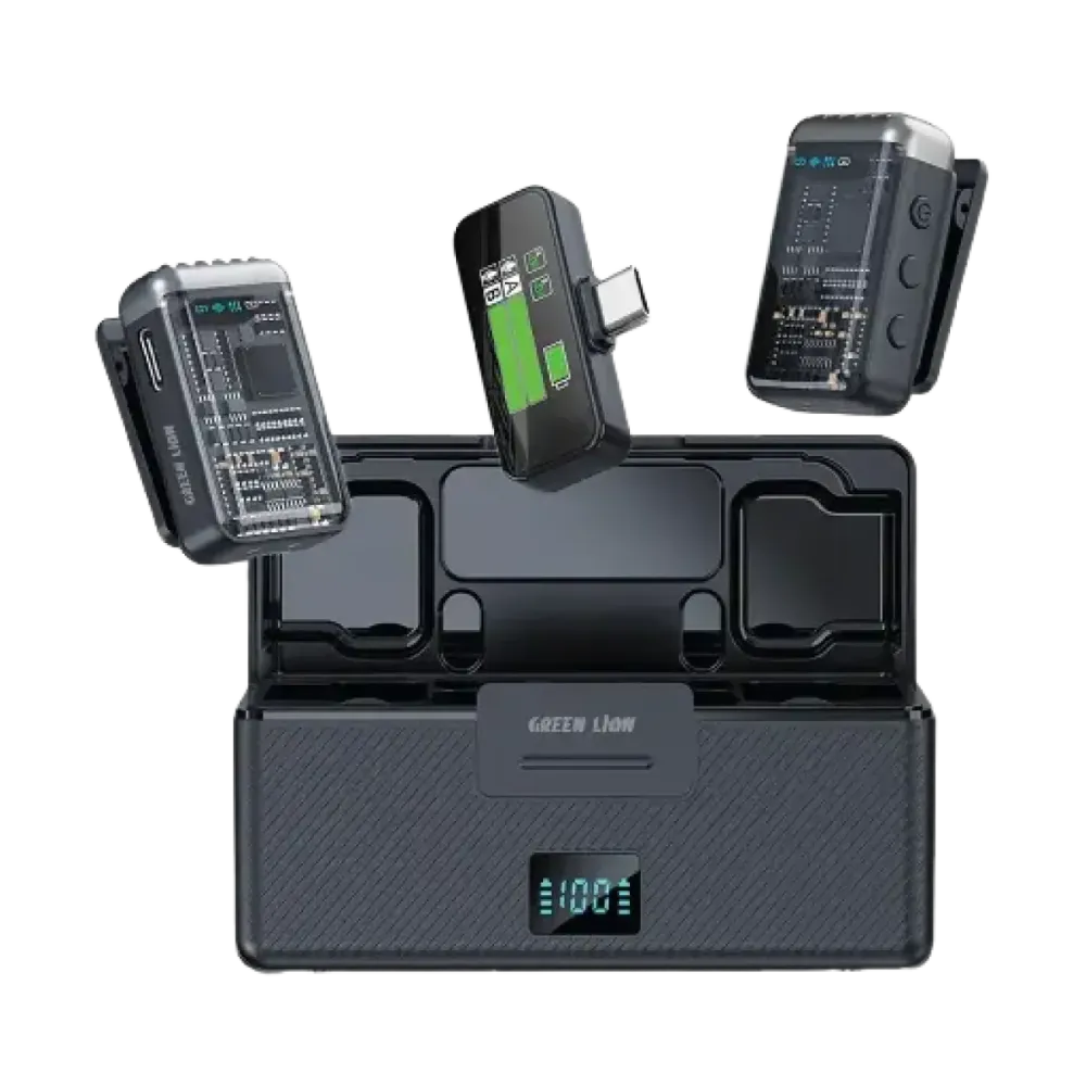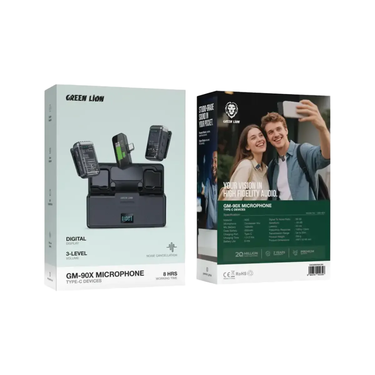 Green Lion (GNGM90XMICBK) GM-90X Wireless Microphone, USB-C - Black Material: ABS Microphone: Condenser Mic Mic Battery: 150mAh Case Battery: 600mAh Charging Port: USB-C Charging Time: 1.5-2H Battery Life: 8H Signal to Noise Ratio: 68dB Sensitivity: -34dB Latency: 20ms Frequency Response: 100Hz-10kHz Transmission Range: Up to 20m Features: Vibration Feedback; 360° Omnidirectional