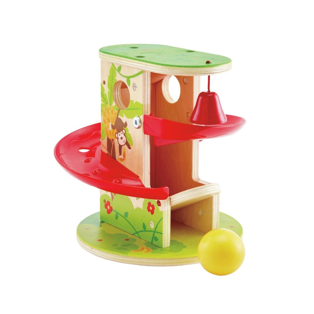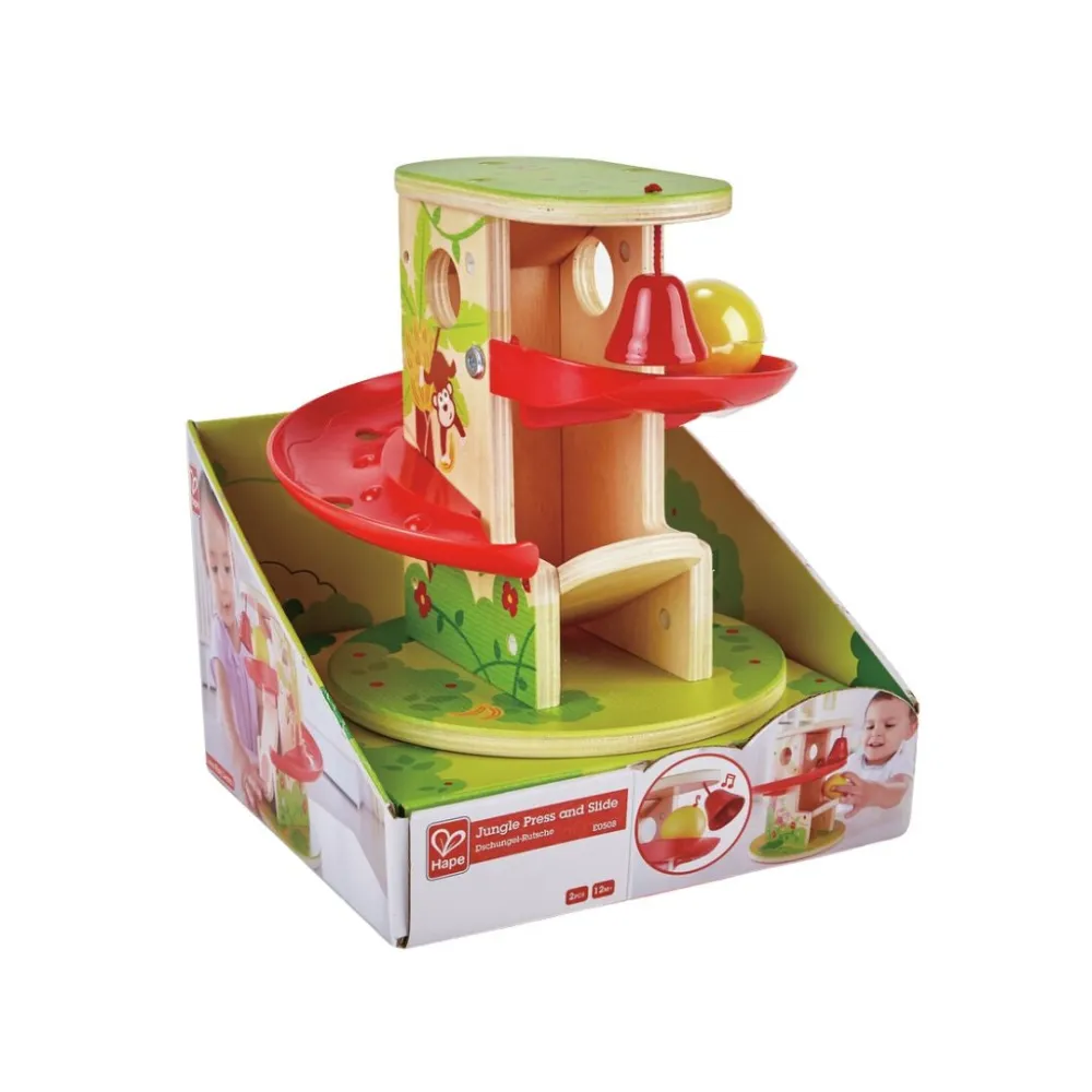 The Hape Jungle Press and Slide Wooden Toy is an engaging wooden toy that allows children to enjoy sliding fun. Kids can make the wooden ball race down the tree and ring the bell, promoting interactive play and motor skills.