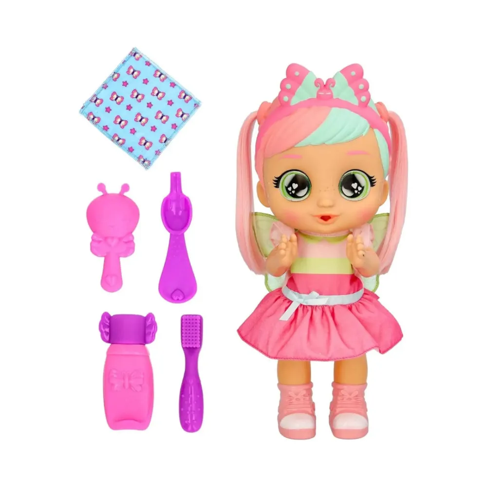 The set includes accessories for role play such as a comb, toothbrush, spoon, towel, and toothpaste.