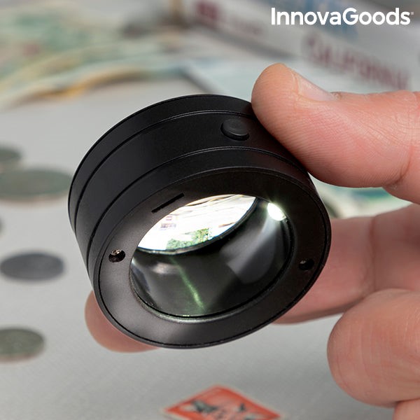 A convenient, practical and lightweight pocket magnifying glass with x5 magnification and LED light (0.08 W) for optimal and much clearer vision. Due to its small design (ø 5 cm) it is easy to transport and store anywhere, as it takes up hardly any space. Ideal for reading texts with small type, such as leaflets, and for viewing details on stamps, maps, coins, photographs, etc. It is also very useful for sewing, for get a good view of the stitching on fabrics, etc. It has a small on-off button for the LED light and it works using 2 x CR1220 batteries (included). Material: ABS Colour: Black Innovative and functional design Type: Electric Wireless Multi-use Reduced compact size x5 magnification LED Light: 0,08 W Button: On/Off Suitable for reading, sewing, etc. Convenient and easy to use Light and manageable Easy to transport and store Battery operated (2 x CR1220, included) Approx. dimensions: Ø 5 x 3 cm