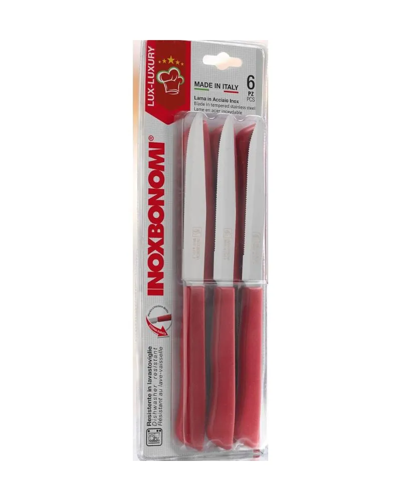 BLS. 6 STEAK KNIFE CM. 11 RED High temperature dishwasher resistant and matte handle with a strong, long-lasting, solid stainless steel 11cm (4.3") pointed serrated blade. Sharp & durable steak knives for smooth cuts. Pack dimensions: 28cm x 8.15cm x 1.8cm (11"x 3.2" 0.7"). Item weight: 156.1g (5.5 oz).