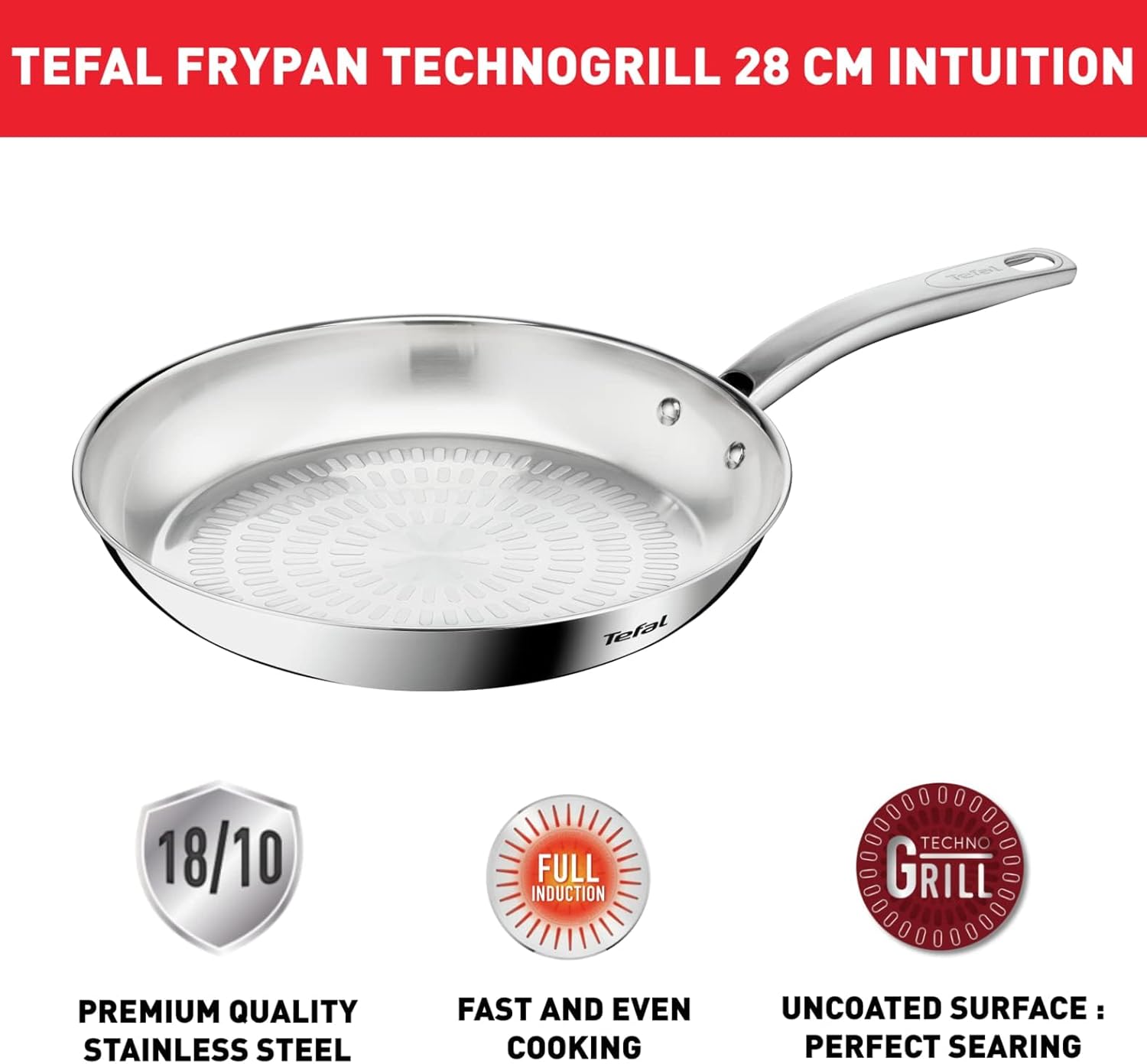 ELEGANCE & SIMPLICITY : A thorough level of finishing for long lasting, shiny and appealing cookware. PERFECT SEARING: Uncoated and textured inner surface for delicious browned meats and vegetables, offering the ideal frypan for deglazing and creating mouth-watering jus, sauces and gravies EASY-CLEANING AFTER SOAKING: A high-resistance surface compatible with scourer sponges and dishwasher-safe 5-YEAR GUARANTEE STAINLESS-STEEL: Ensuring long-lasting performance and reliability, discover a premium-quality product with robust design that's built to last FAST AND EVEN COOKING: Cookware set with Thermo-Fusion base, for fast and even cooking and long-lasting performance. Compatible with all hobs, including induction and oven safe up to 250°C. ROBUST HANDLE: The extra-resistant no-gap handle ensures greater safety and easier handling while cooking