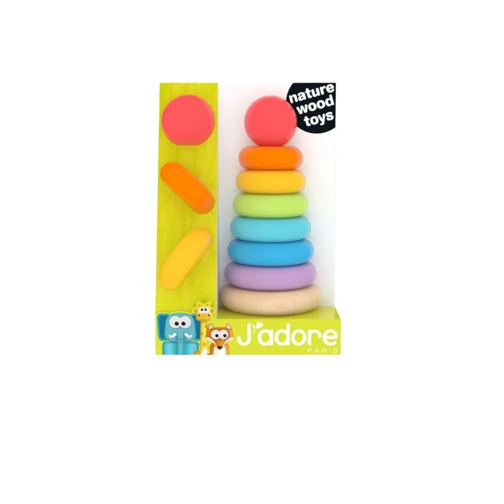 The J'Adore Rainbow Ring Wooden Toy is an engaging toy designed to promote developmental skills in young children.