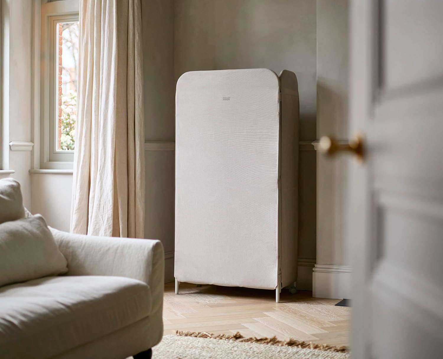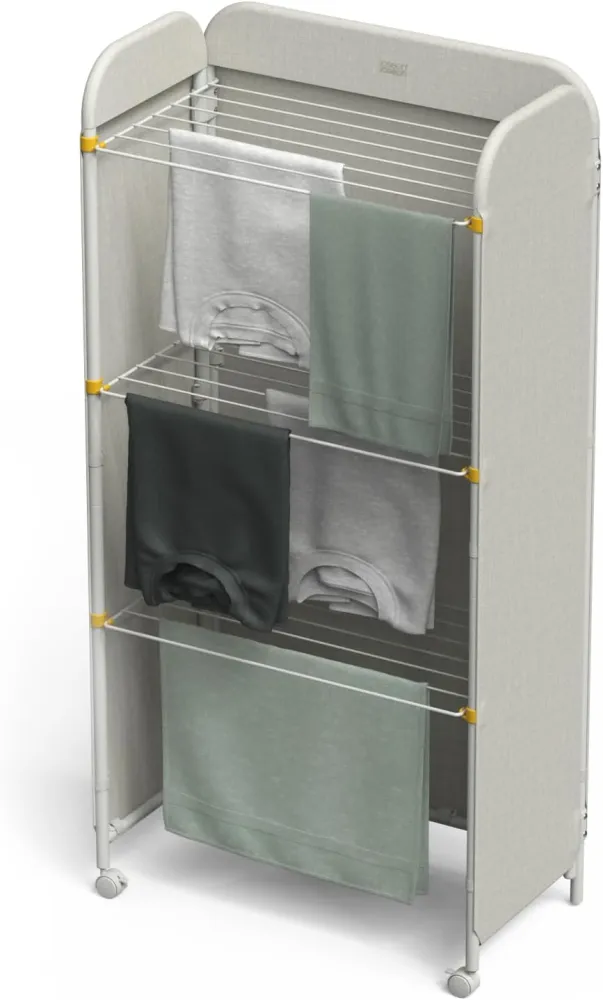 Eclipse 3-Tier Adjustable Laundry Drying Rack, Integrated Fabric Cover, Foldable with Wheels, Heavy Duty, Ecru,Product Dimensions 15.7"D x 29.1"W x 59.1"H, stylish fabric Cover: Elegantly conceals laundry, blending seamlessly with various room decors.