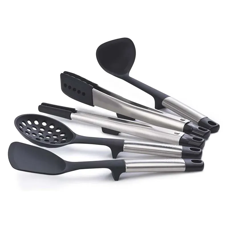 Set includes solid turner, ladle, slotted spoon, precision tongs, large tongs