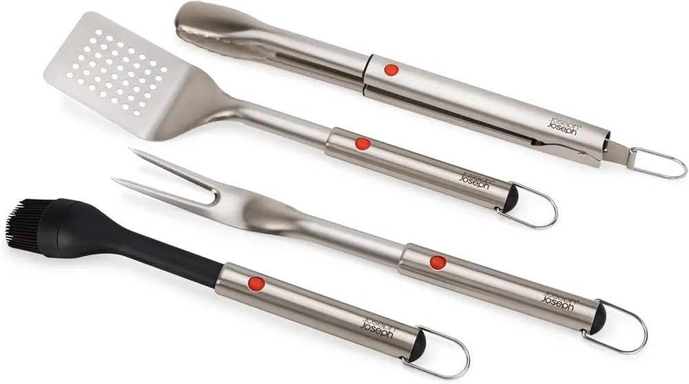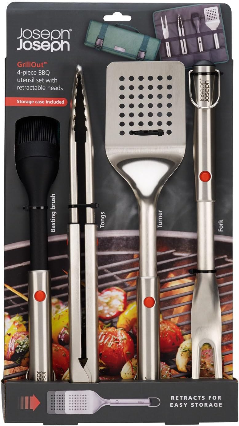 5-Piece Stainless Steel BBQ Utensil Set with Storage Case, Brush, Tongs, Turner & Fork, Retractable for compact storage, Easy-clean, Durable stainless-steel construction