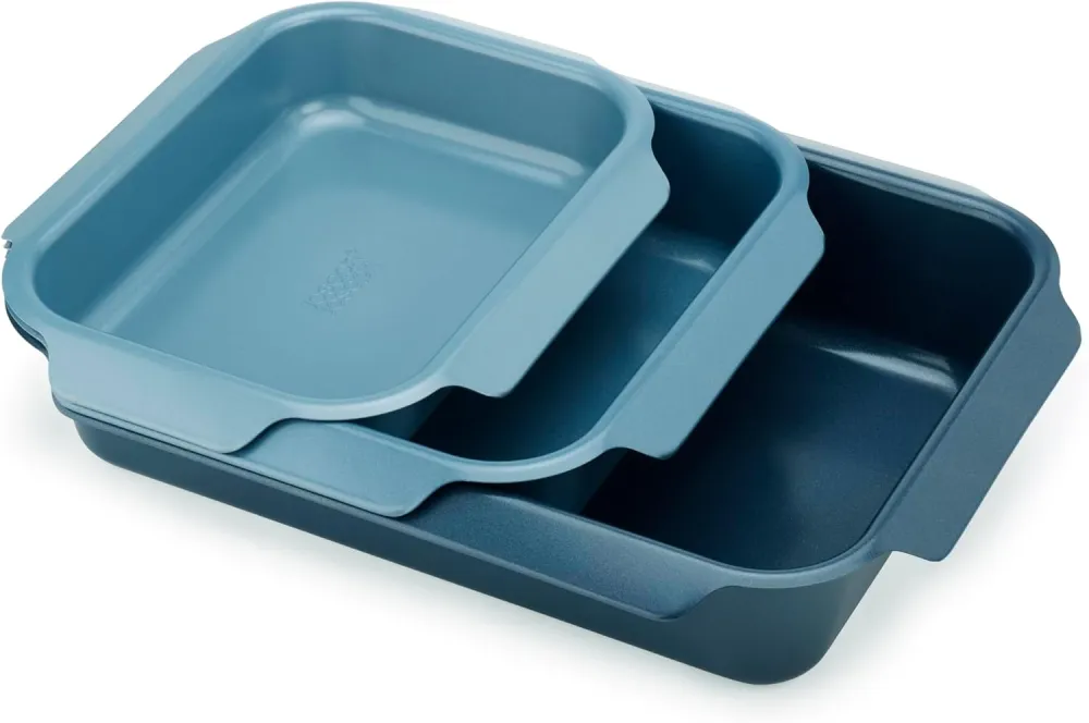 These stackable trays feature easy-pull handles on the sides to provide a larger gripping point when wearing oven gloves, making them easier and safer to handle.Durable dual-layer, non-toxic, non-stick coating that's free from PTFE, PFAS, PFOA, Lead and Cadmium.Designed to stack and store neatly with space between each tray to improve airflow and avoid scratches.Small: H2.96 x W30 x D23 cm (H1.2 x W11.8 x D9.1 inches) Medium: H2.96 x W32.6 x D30 cm (H1.2 x W12.8 x D11.8 inches) Large: H2.96 x W40.9 x D30 cm (H1.2 x W16.1 x D11.8 inches)