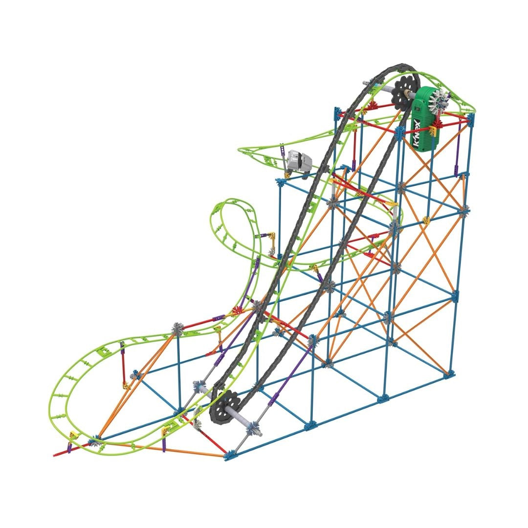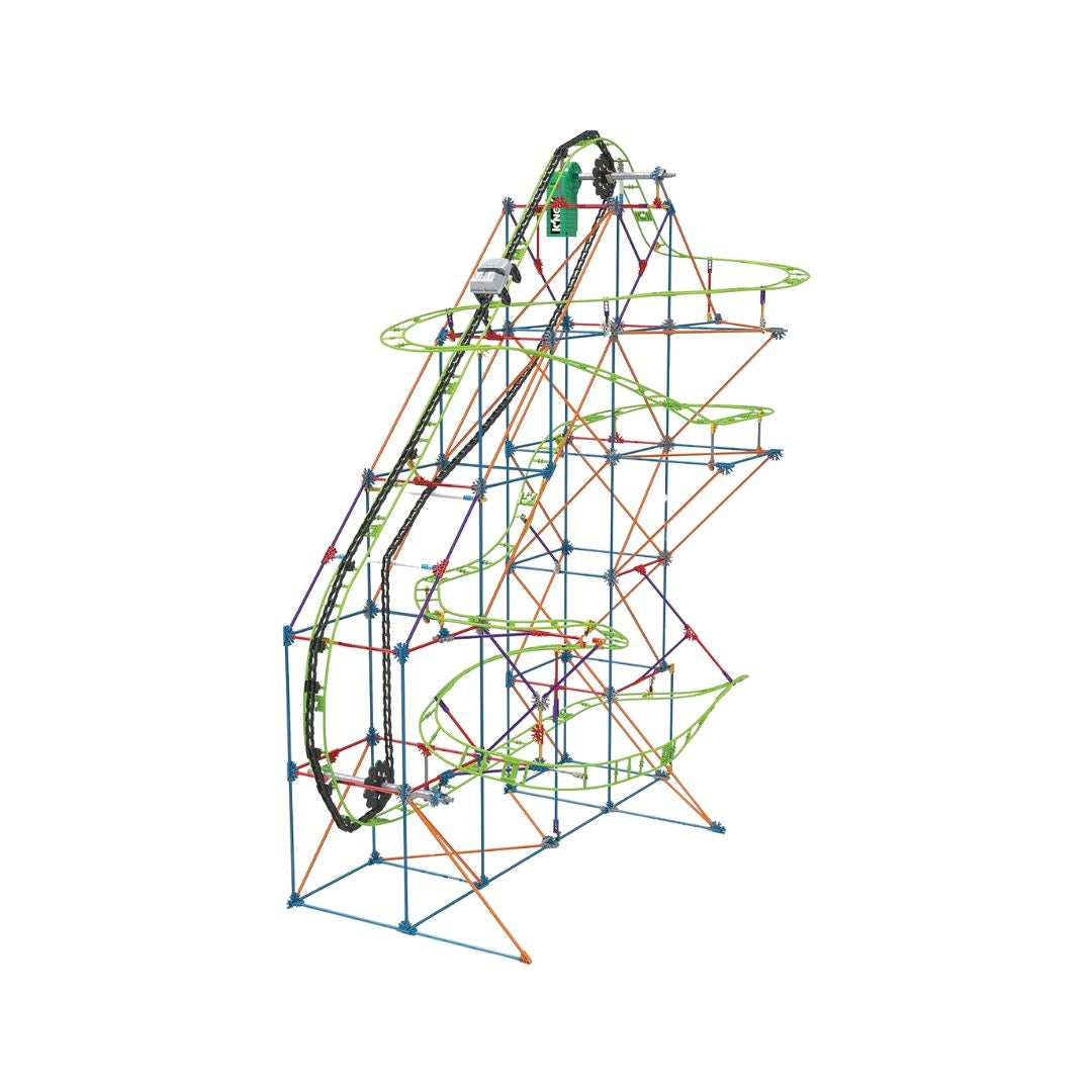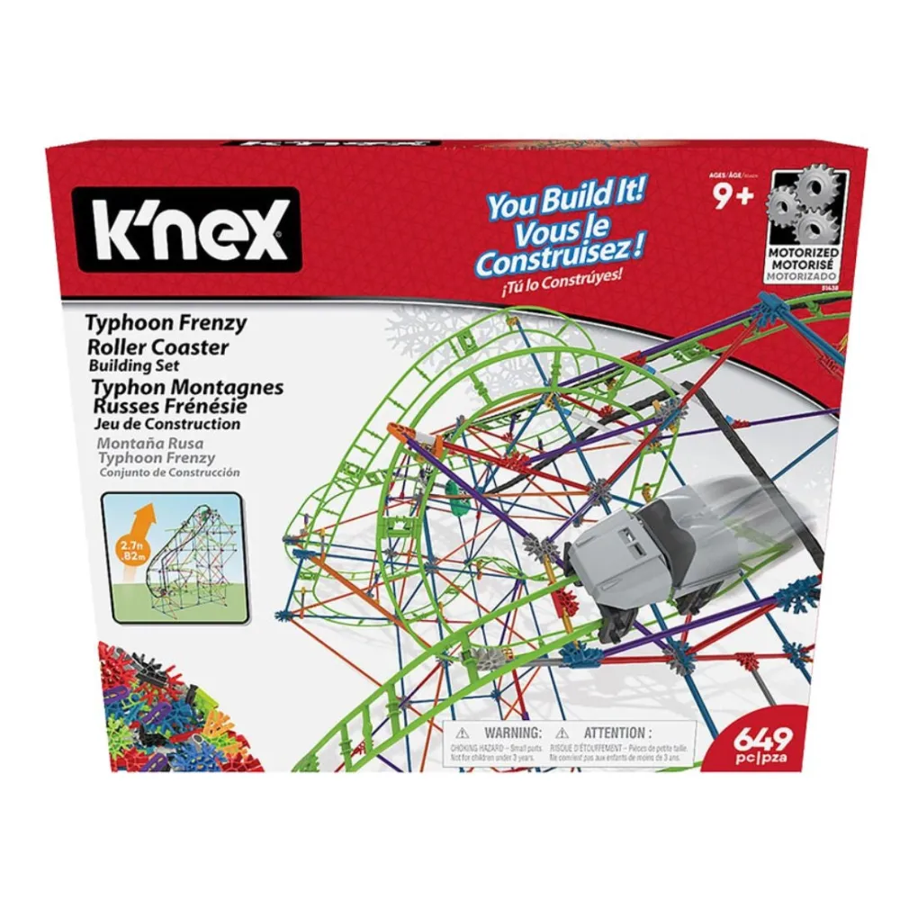 The K'NEX Typhoon Frenzy Roller Coaster Building Set allows users to construct a 19-foot-long roller coaster using over 640 pieces. This engaging set includes a motorized power system and a silver coaster car, offering an exciting building experience for both kids and adults.