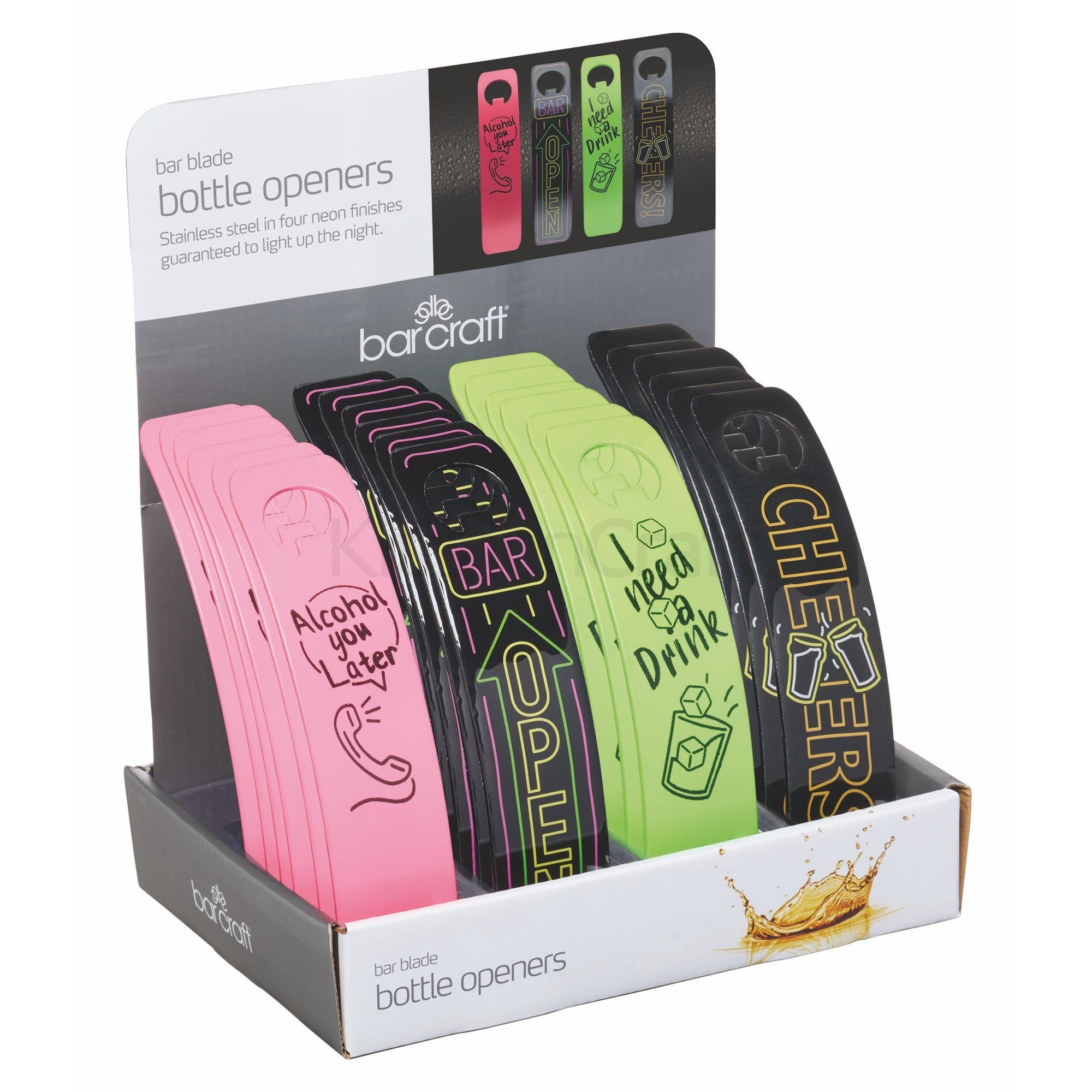 Light Up The Night With The Perfect Pick Up Gift! Stainless Steel Bar Blade Bottle Openers With A Bold Neon Finish And Four Fun And Funky Designs To Get The Party Started.Designs Include - "Cheers!" / "Alcohol You Later" / "Bar Open" / "I Need A Drink"Features & Benefits