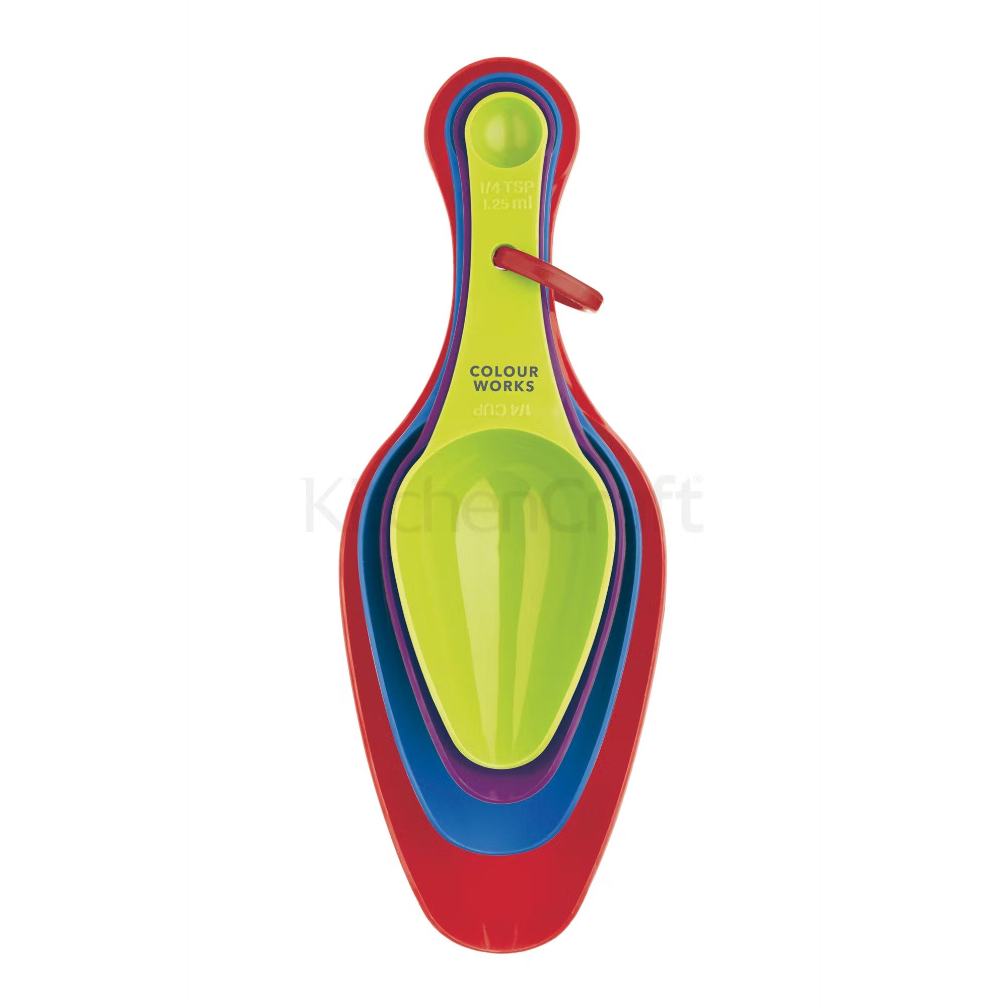 Keep all of your measuring spoons nested neatly together to save on storage space and keep them neat and tidily in your drawers. With a removable ring for easy use and storage, this set of 4 double ended measuring scoops features cup, spoon and ml measures. Make the most of your culinary creations by getting exact measurements each and every time. Designed to co-ordinate with a number of items in the Colourworks range, allowing you to mix and match your kitchen in a striking array of colours.Dishwasher safe.Dimensions: 22.600 x 7.900 x 5.000cm Product Weight in KG: 0.068 Product Weight in KG (Including Packaging): 0.126 Colour: Multicolour Material: Plastic Five year guarantee.price for 1pc