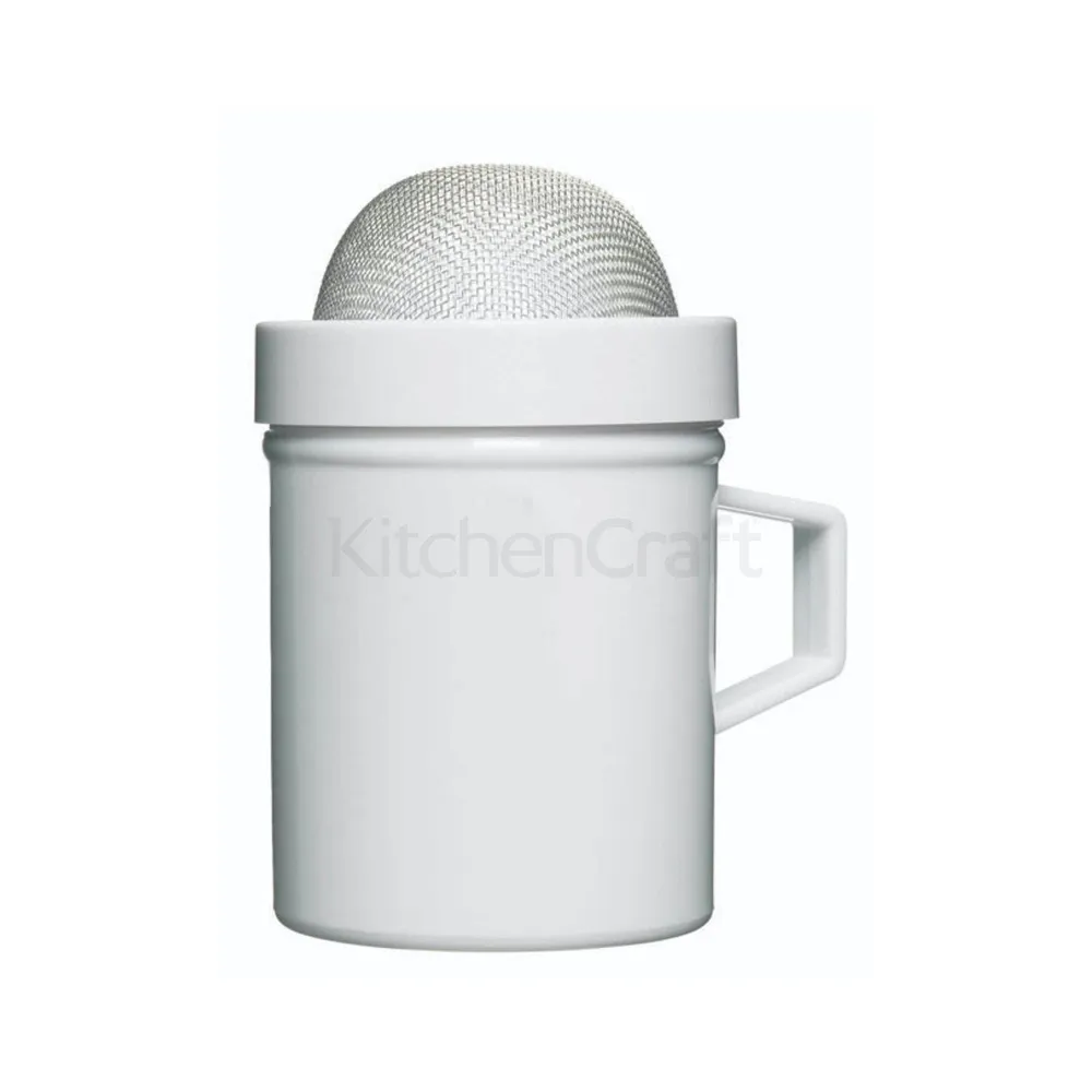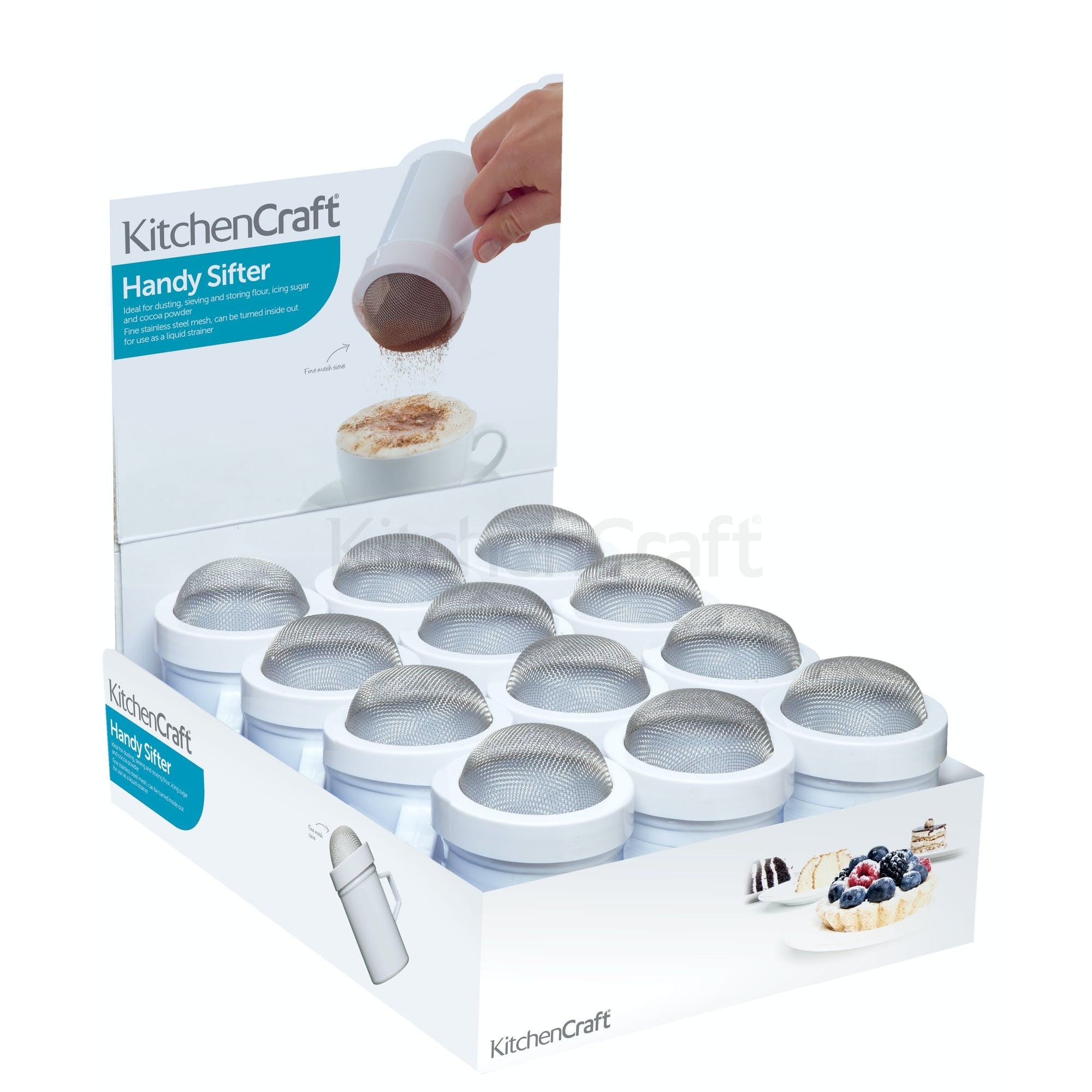 Handy sifter for dusting, sieving and storing flour, icing sugar and cocoa powder. The plastic sifter features a side handle and screw on domed fine mesh gauze lid, which can be turned inside out for use as a liquid strainer. Supplied as a counter top display with twelve sifters.Handwash only.Dimensions: 29.000 x 22.000 x 11.000cm