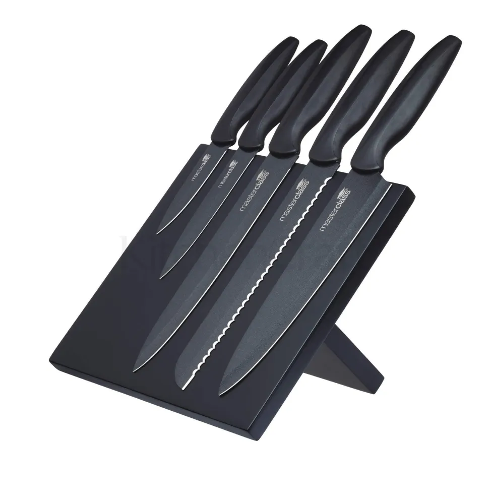 The striking six-piece Agudo knife set is beautifully modern and so, so stylish. But it’s not all about looks – the five knives are made of premium stainless steel for outstanding durability and long-lasting sharpness. With its beautiful magnetic storage stand, it’s the perfect presentation piece for your kitchen. It makes a great gift for new movers, or a quick and easy way to replace dull, worn knives. The set includes a 20 cm (8”) chef’s knife, 20 cm carving knife, 20 cm bread knife, 12.5 cm (5”) utility knife and a 9 cm (3½”) paring knife. Long-Lasting Sharpness – Guaranteed! The MasterClass Agudo knives feature high-quality stainless steel blades with a non-stick coating. The stainless steel ensures durability and long-lasting sharpness, while the non-stick finish means your knives glide effortlessly through ingredients. The knives are designed to last for years, and come with the MasterClass 25 year guarantee. Designed for Comfort and Convenience Each knife has a contoured, soft-grip handle for safe and comfortable use, and maximum control. You can easily slice, cut and dice your way through all sorts of meats, fruits, vegetables and breads. The knives sit on the magnetic board at an angle, for quick and easy access. The magnetic board also folds away for easy storage. Useful Information — Knives are dishwasher safe (handwashing recommended for first 12 months) — Magnetic rack is wipe-clean only — Comes with the MasterClass 25 year guarantee More Cutting Tools by MasterClass The Agudo knife set is part of a wide range of knives and accessories from the premium MasterClass collection. To keep your knives super sharp and preserve their precision cutting capabilities, why not pair this set with the MasterClass Sharpening Steel? Simply search for product code MCTRADSTEEL.Knives are dishwasher safe.Dimensions: 22.500 x 34.000 x 6.500cm