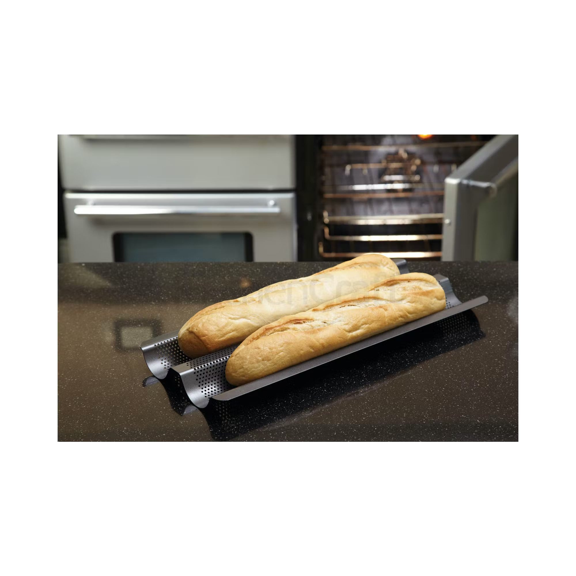 Perfectly Crispy Baguettes: Designed with crescents to hold two baguettes securely, ensuring even baking and a beautifully shaped loaf.