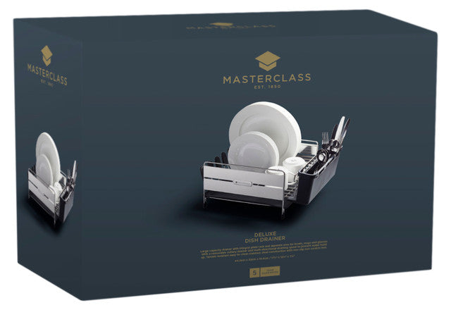This large dish rack is Master Class’s deluxe take on a kitchen classic. Its generous proportions mean there’s plenty of space for plates, cups and cutlery, and it’s packed with clever features to take the hassle out of washing up. At 44.5 x 32 cm (17½” x 12½”), this dish rack is great for big washing up jobs (like a post-dinner-party clean-up!). It makes efficient use of this space, with room for plenty of dinner plates, plus extra storage for cutlery, cups, mugs and more. And with its durable, stylish construction and raised rubber feet, it’s specially designed to be long-lasting and resistant to rust. It’s a quick and hygienic way to dry your dishes, so you don’t have to waste time with a tea towel. Ingenious Drip Tray and Draining Spout Have you ever left plates and cutlery to dry on the draining board, and come back later to find a pool of unpleasant-smelling water? This washing up drainer has a clever solution – a removable plastic drip tray, complete with a multi-directional draining spout. This collects any water that drips off your dishes and directs it back into the bowl. It’s a hygienic way to deal with water build-up, and it prevents unpleasant smells and rusty draining boards too. With Cutlery Holder and Cup Rack The included cutlery holder provides a handy, safe place to store your knives, forks and spoons while they drain. And because it’s removable, it makes it really easy to put your cutlery away once it’s dry. The rack also includes an integrated mug holder, which holds up to three cups or glasses, even when the drainer is full. Durable and Stylish The Master Class Large Deluxe Stainless Steel Dish Drainer Rack will fit right in with any kitchen. Its shiny stainless steel look is stylish and versatile, as well as offering excellent durability, tarnish resistance and odour resistance. Useful Information — Measures 44.5 x 32 x 19.5 cm (17½" x 12½" x 7½") — Cutlery holder, drip tray and spout made of BPA-free, food-safe plastic — With non-slip, non-scratch rubber feet to prevent rust and scratches — Hand-wash only — Comes with a five year guarantee.Handwash only.Dimensions: 46.000 x 33.000 x 19.300cm