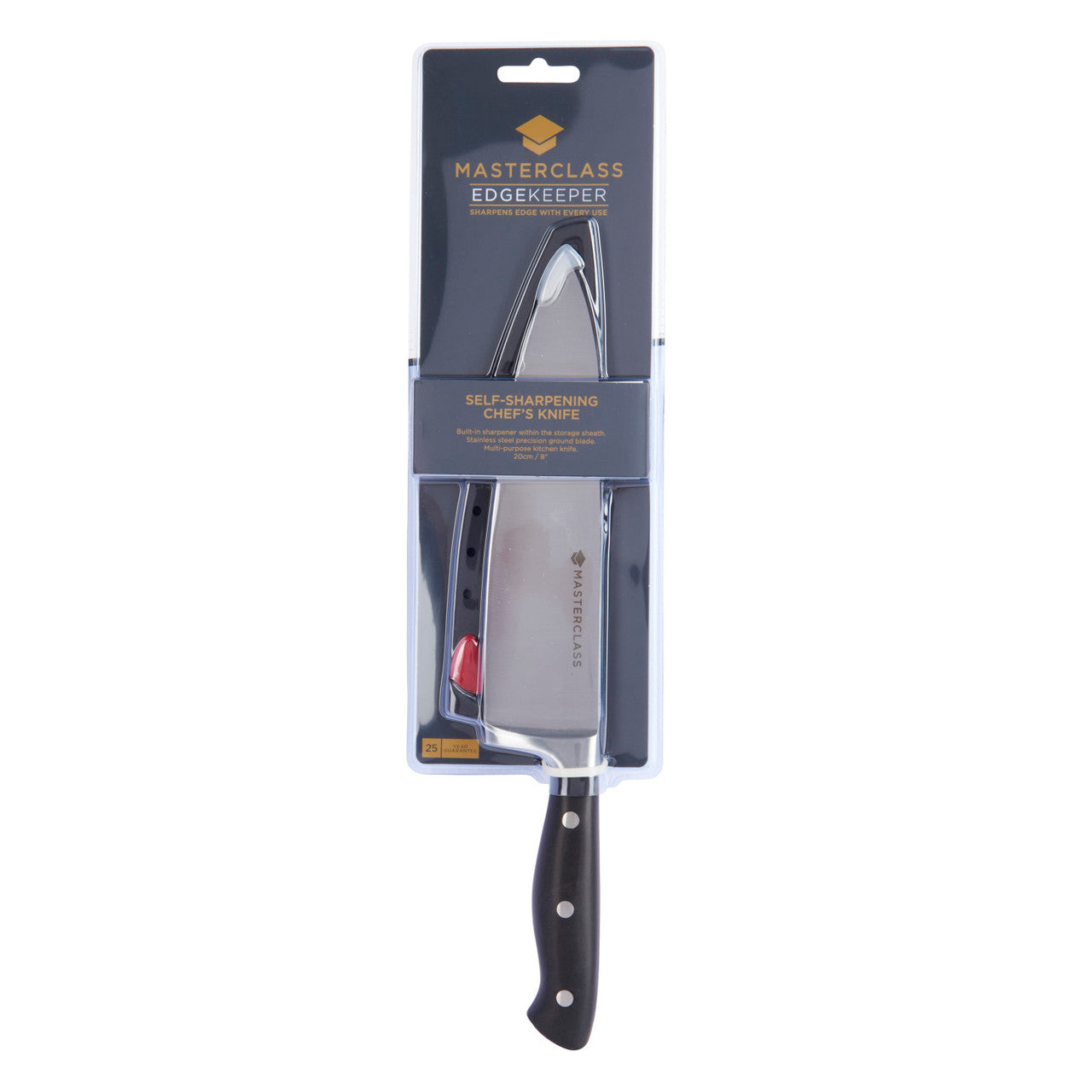 What if you could enjoy razor-sharp cutting performance, but without actually having to sharpen your knives? MasterClass's EdgeKeeper knives maintain themselves, so you don’t have to. Their innovative self-sharpening technology means your knives always cut with fresh-from-the-factory sharpness. And because they’re made of high-carbon stainless steel, they’ll retain their precision edge and are built to last for years. In fact, they’ll only get sharper the more you use them. Built to last, this knife is covered by MasterClass' 25-year guarantee.Sharpens with every use