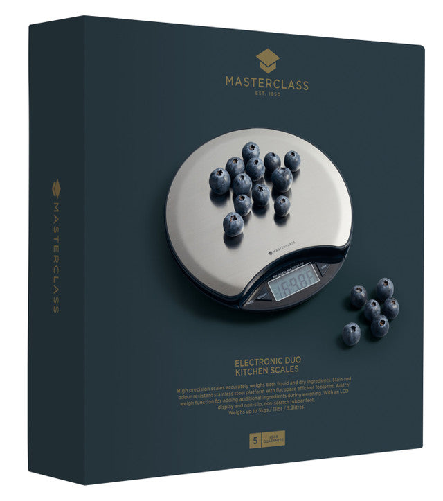 The MasterClass ‘Dry & Liquid’ Round Digital Kitchen Scales are perfect for cooking and baking. With their high-precision sensor, they provide accurate weights for wet and dry ingredients, and can calculate liquid volume too! This is really handy for adding liquid ingredients straight into the bowl when baking – simply use the tare “add ‘n’ weigh” function to reset the scales, then pour in the required volume of liquid while checking the display. Easy! Designed for Hassle-Free Cooking With a stainless steel weighing plate that's odour and stain resistant, these electronic scales are perfect for the kitchen. The smooth flat platform is suitable for almost any mixing bowl, and with its generous 5 kg (11 lb) capacity – and 5.2 L (9 pt) volume capacity – you can mix up big batches of cake batter without trouble. The slim-line contemporary scales will go beautifully with any kitchen décor, and when not in use can be stored easily and neatly. The non-slip and non-scratch rubber feet mean your work surfaces are protected too. Really Easy to Use These kitchen scales couldn’t be easier to use – there’s one button to turn the unit on and reset the scales, and another to change between metric, imperial weight and liquid capacities. The contrasting LCD panel is really easy to read, so you won’t find yourself straining your eyes while following a complicated recipe. They even have a battery life indicator, so you don’t have to worry that your scales might stop working when you’re in the middle of making a super-important cake! Useful Information — Measure 17 cm (6½”) — Requires 1 CR2032 battery (included) — Wipe-clean only — Comes with a 5 year guarantee.Wipe clean only