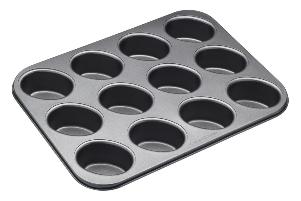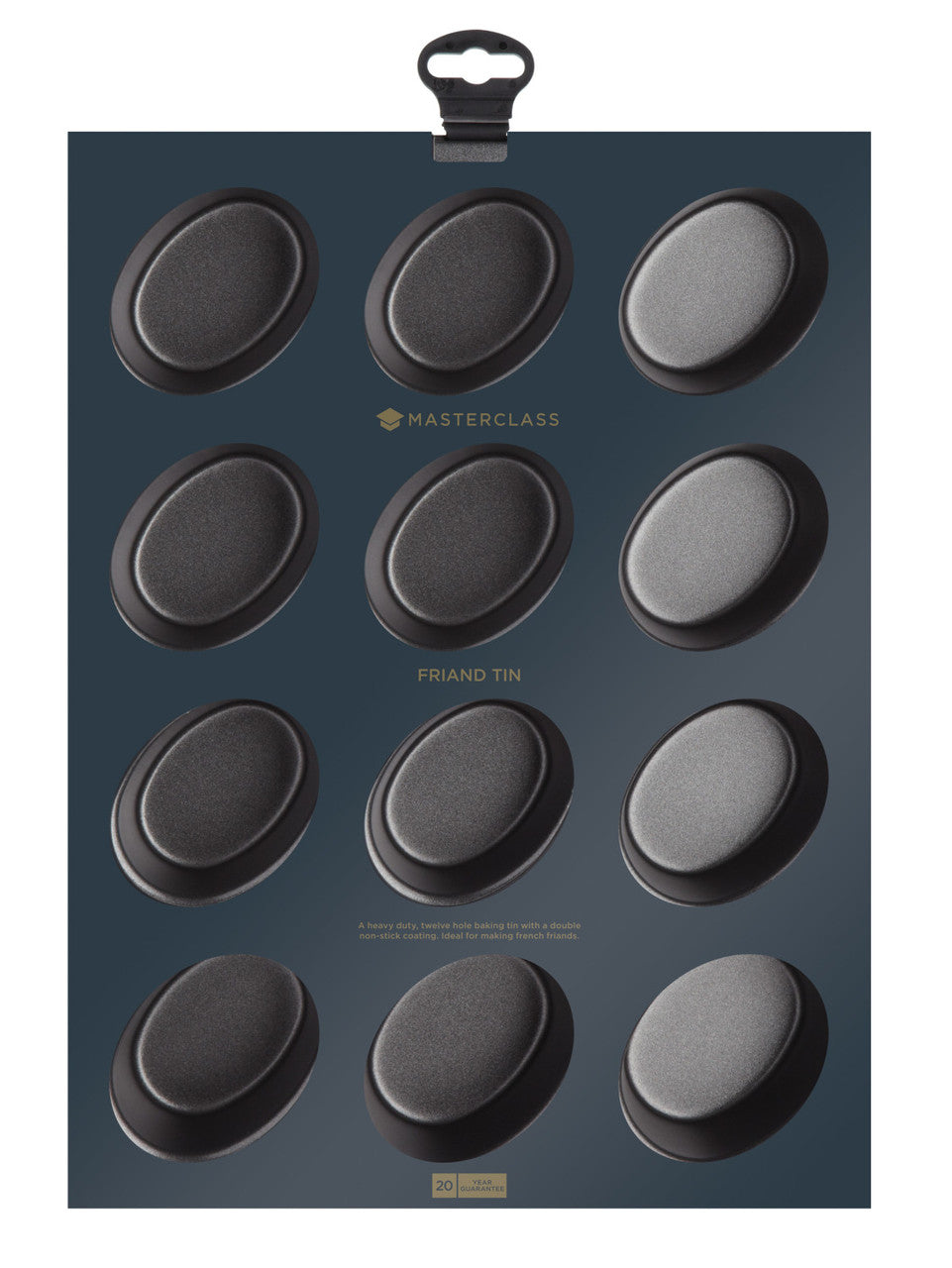 This MasterClass 12-Hole Non-Stick Friand Tin is made of commercial-grade carbon steel and features a clever double non-stick coating. With its premium quality materials, it makes it much easier to bake lovely, feather-light friands. This heavy duty baking pan measures 35.5 x 26.5 cm (14” x 10”), and features 12 friand moulds measuring 7.5 x 5.5 x 4 cm (3” x 2” x 1½”), perfect for afternoon tea, or as dinner party puddings. Its also covered by MasterClass’s 20-year guarantee and 5-year non-stick guarantee.Dishwashers, fridge, freezer and oven safe to 220°C.Dimensions: 27.000 x 35.000 x 4.300cm