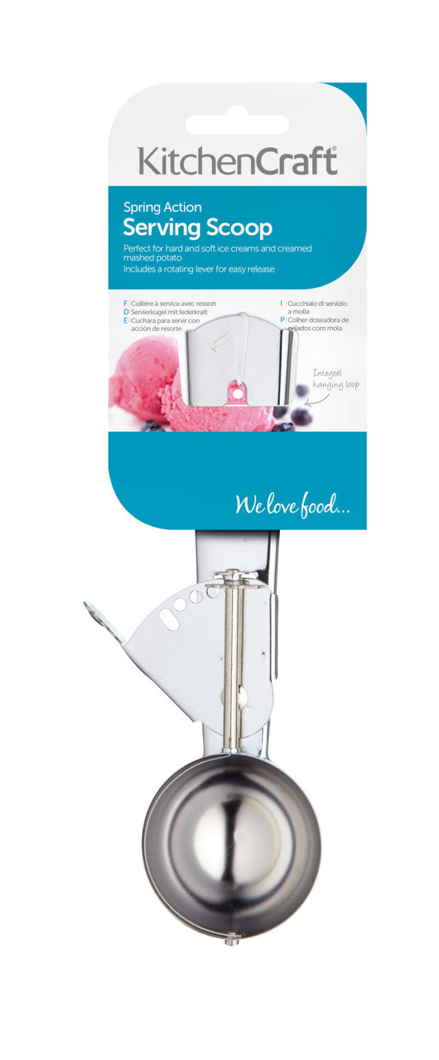 The KitchenCraft Metal Ice Cream Scoop is definitely an ‘oldie but goodie’! With its traditional trigger-action design, it makes scooping and serving portions of ice cream, sorbet and gelato easy. It’s so much simpler than using a spoon, and means less mess! But why stop at ice cream? You can also use it to spoon cupcake mix, muffin batter or cookie dough into baking pans in even portions. The ice cream scoop is ideal for serving creamy mashed potatoes too – just like you used to have with school dinners!Handwash only.Dimensions: 21.000 x 7.500 x 3.500cm